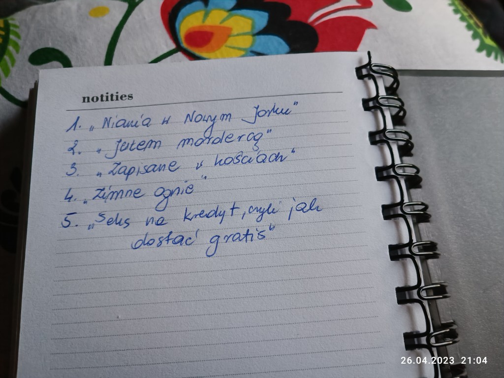 A ja zapisuję w notesie przeczytane od Nowego Roku książki. Narazie tylko 5. Zobaczymy, jak pójdzie dalej.