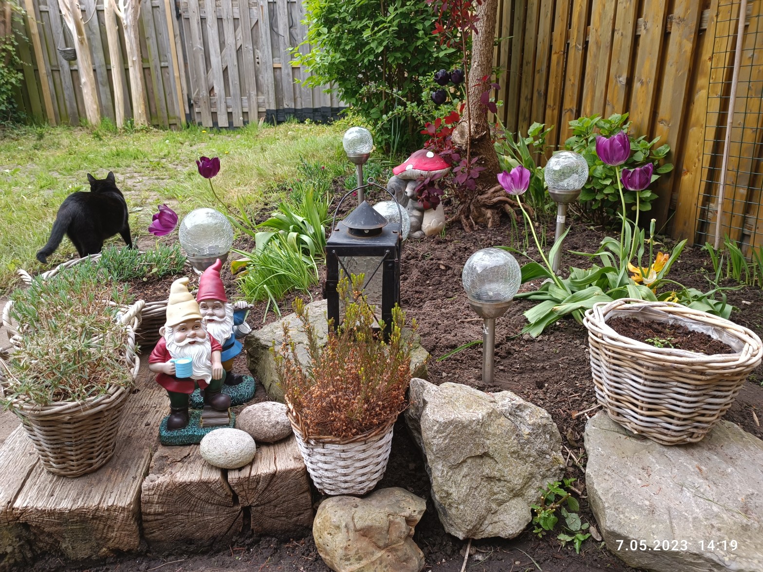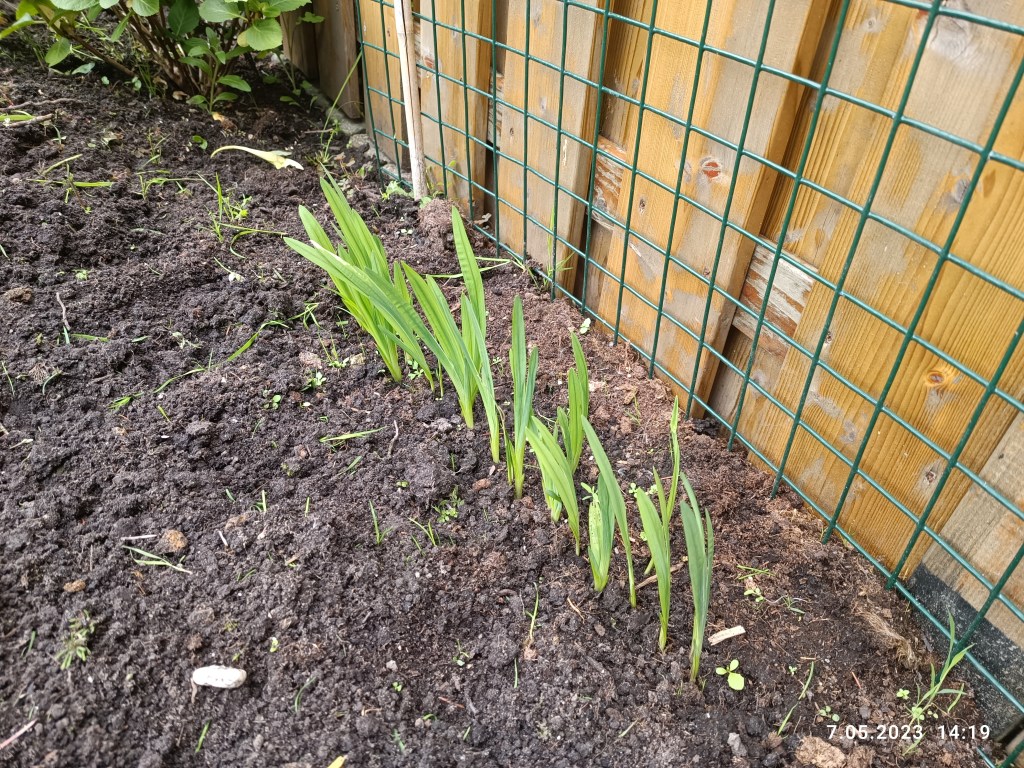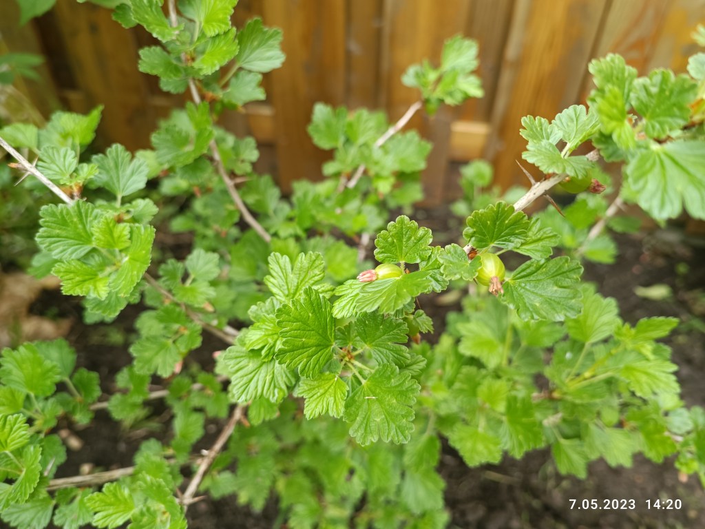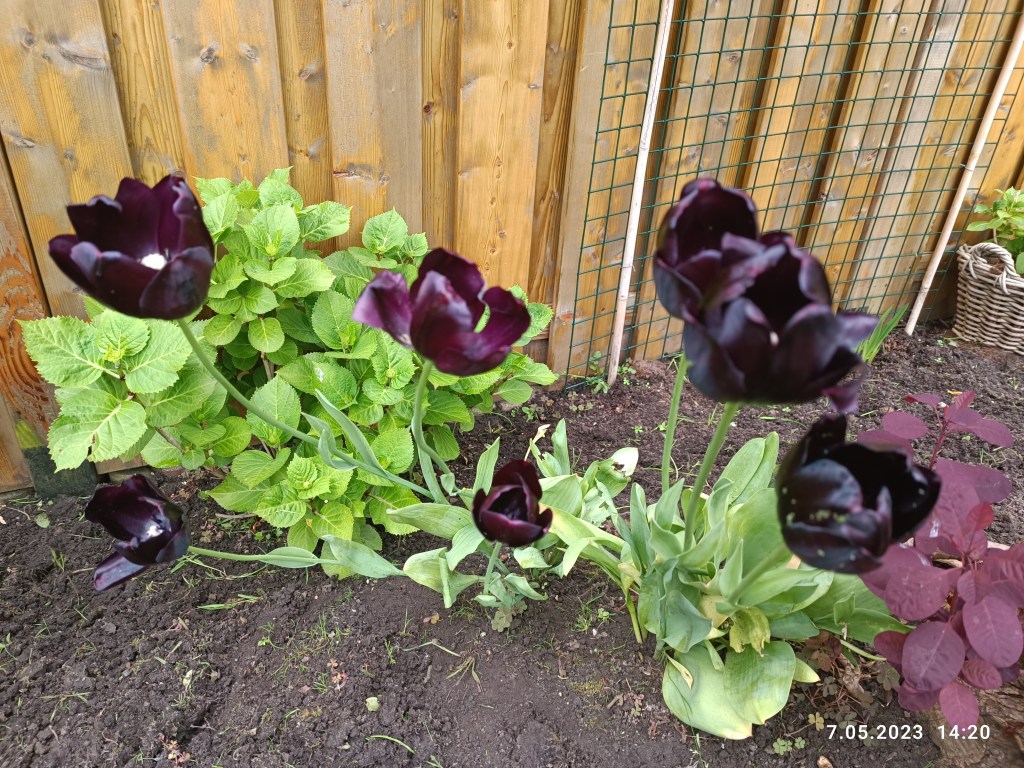W ogródku małe zmiany. Nie ma już choinki. Niestety schła w zastraszającym tempie i trzeba było ją wyciąć. Posiane rośliny powoli wschodzą a tulipany przekwitają. Jaśmin ma małe pączki a agrest owoce.