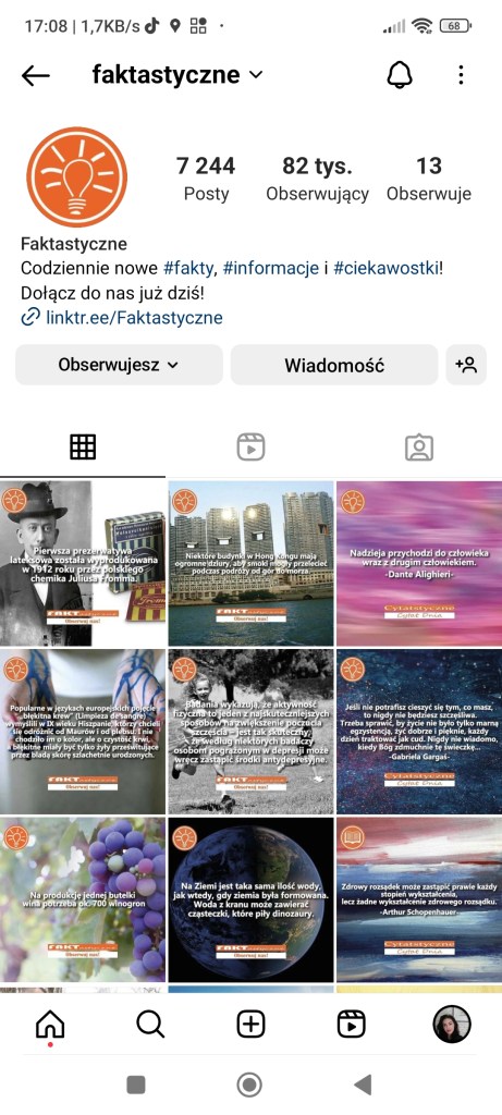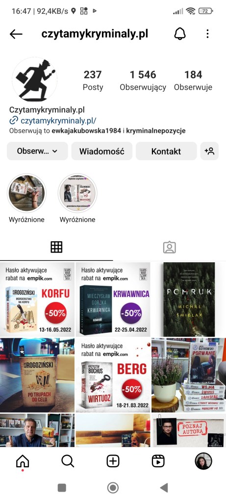 Profile związane z książkami są dla mnie bardzo ważne. Dodawane są polecajki z opisami (te opisy są akurat potrzebne 🙂), do tego lubię oglądać zdjęcia księgarń. Obserwuję również mojego ulubionego mistrza horroru, czyli Grahama Mastertona