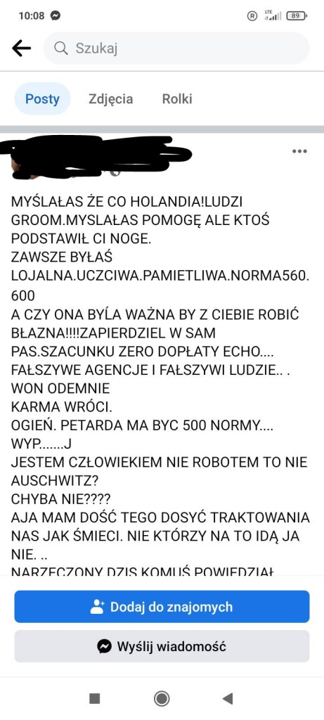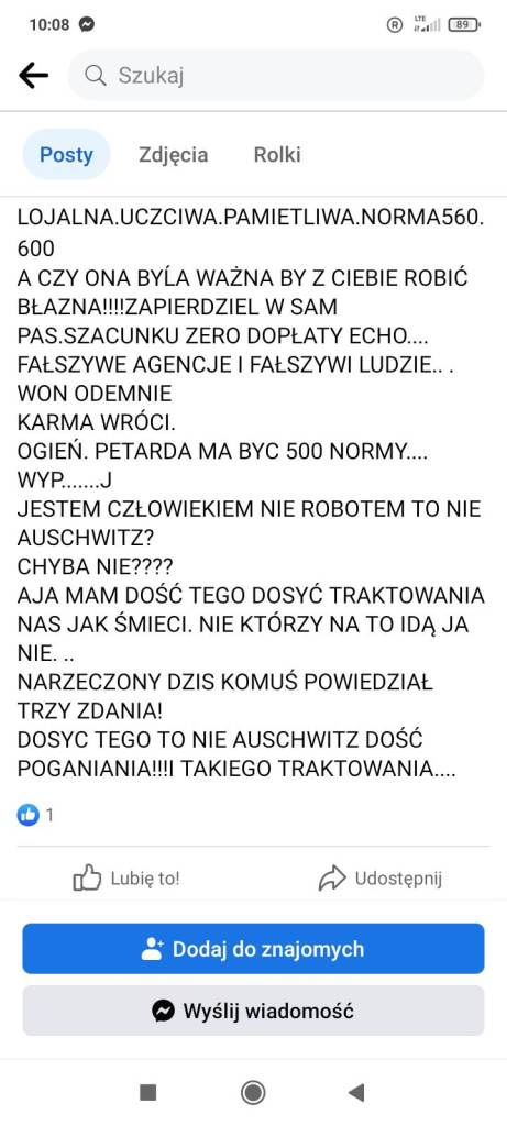 Pozwoliłam sobie wkleić ten apel, bo dziewczynę najwyraźniej poniosło. Ciężko trochę zrozumieć, co tam napisała. Wyjaśnię, że chodzi o to, że traktuje pracę u nas jak Auschwitz. Nie zgodzę się z tym, bo szef obchodzi się często z ludźmi jak z jajkami. A wierzcie mi, że niektórym przydała by się musztra. Myślą, jak za PRL-u: czy się stoi, czy się leży – 1500 się należy. Nie, to tak nie działa. Jest przecież praca do wykonania, czas leci i trzeba ją zrobić. Po drugie, jeśli ktoś porównuje pracę w Holandii do obozu koncentracyjnego, to polecam posłuchać podcasty na ten temat. Jak można porównywać w ogóle cierpienie tysięcy osób do swojego lenistwa i humorów?! K. w swoim wpisie opowiada też, że tylko norma i norma. Z tą normą u nas jest tak, że taki pełen wózek pomidorów można spokojnie naciąć „z palcem w dupie”. On sobie sam jedzie a ty tylko idziesz. Nie ma wymogu biegania, ścigania się, bo czas itp. To jest prosta praca. K. bez problemu dawała radę. Nagle już miała z tym problem. Napisała też, że była lojalna i uczciwa. Nie, nie była. Wystawiała nas nie raz do wiatru, gdy potrzeba było rąk do pracy. Pierwsza wypłata i już choroba.