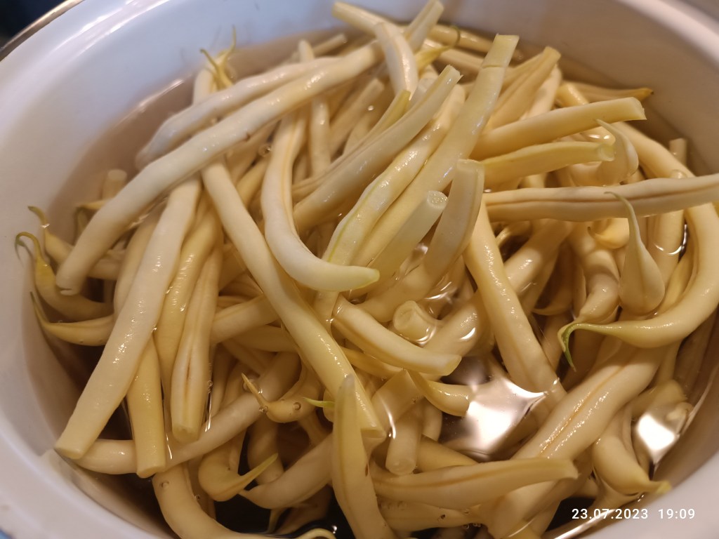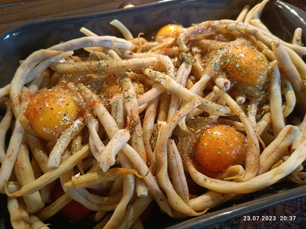 Byłam ostatnio w polskim sklepie po chleb i natknęłam się na żółtą fasolkę szparagową. Co ciekawe, w holenderskich sklepach widziałam do tej pory tylko zieloną. Kupiłam trochę tej fasolki i pomyślałam, że zjemy z masłem i bułką tartą. Ale potem zobaczyłam filmik na przyrządzenie jej w inny sposób, którego nie znałam. I musiałam wypróbować. Nie zrobiłam wszystkiego dokładnie, jak w przepisie, bo zawsze lubię coś zmodyfikować. Oryginalnie potrzebne składniki to fasolka, 3- 4 jajka, ulubione przyprawy i ser mozzarella. Ja dodałam pomidorki koktajlowe, a że nie miałam mozzarelli, to dodałam cheddar.