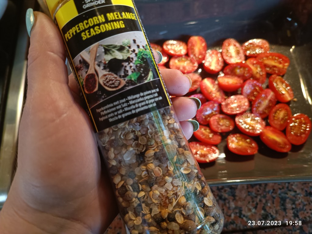 Fasolkę gotujemy w osolonej wodzie do takiej miękkości jaką lubimy. Naczynie polewamy lekko oliwą z oliwek i układamy połówki pomidorków. Przyprawiany – ja użyłam tylko mix młynkowy kupiony w Actionie i suszone zioła.