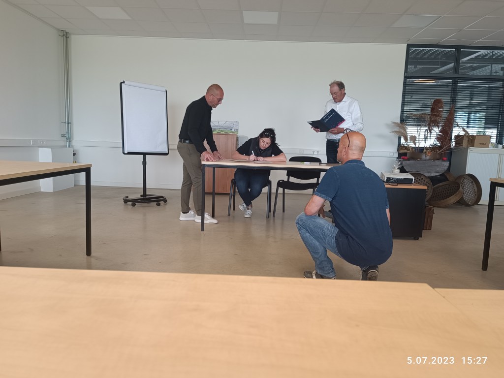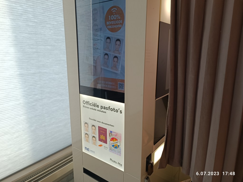 Siadamy za kotarą, wrzucamy kilka monet (chyba to było 7€) i wybieramy opcję zdjęcia: paszportowe, do dowodu lub prawa jazdy. Głos mówi, jak ustawić głowę, itp. Języki do wyboru: holenderski, niemiecki, turecki, polski. Panu Mężowi poszło szybko, bo już tutaj zdjęcie robił do zmiany prawa jazdy. Mnie ustawienie twarzy średnio szło. Ale udało się. Maszyna wypluła 4 sztuki a do paszportu potrzeba tylko jednego. Wyszłam, jakbym w pierdlu była. Tylko numerka brakowało.
