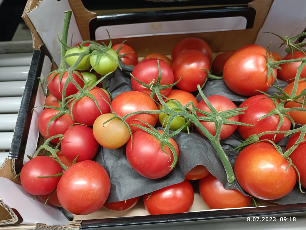 Zdjęcie przedstawia jedno z wielu pudełek z towarem na wadze. Byłam wtedy sama na magazynie i myślałam, że mnie szlag trafi. Dlaczego? Bo niektórzy mają w dupie to, jak powinien wyglądać pomidor do sprzedaży. Nikt nie kupi małych, zielonych orzeszków. Odcinać się pracownikowi nie chce, nawet pod spodem takie są. I taki jeden z drugim ma gdzieś, że ja muszę się z tym męczyć, żeby zrobić wszystkie palety, podczas gdy oni już wesoło jadą do domu! Dlatego czasem mam dość, dlatego czekam na urlop jak na zbawienie. Chcę odpocząć. I gdy niemal wszyscy latem biorą wakacje i jadą do Polski, ja czekam. Czekam aż wrócą i będą w pracy. Wtedy powiem „nara, wy się teraz męczcie” XD