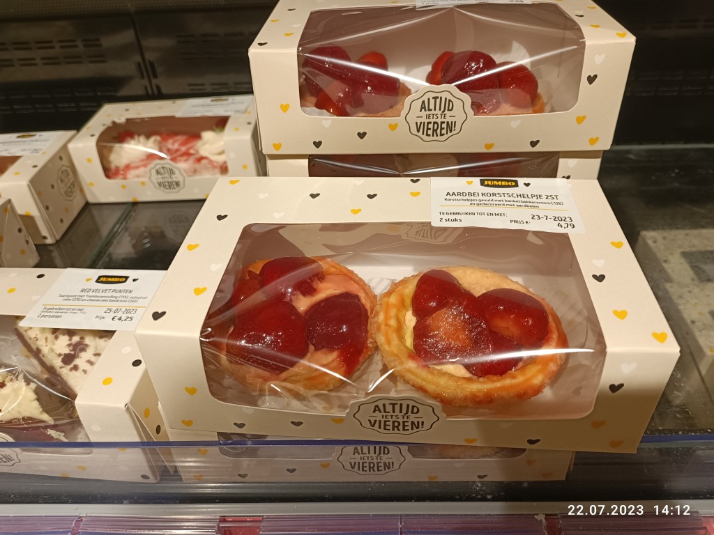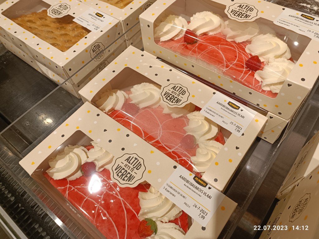 2. Ależ mi ślina do ust naszła! Wow! Jumbo to mój ulubiony sklep, choć nie jest najtańszy. Vomaar ma świetna sałatkę z łososiem ale jumbo najlepsza sałatkę cesear. Co zaś do ciast… W Polsce unikałam ciast z marketów bo były suche i niesmaczne. Tylko ciasto babci lub z cukierni mi smakowało. Zaś w Holandii to właśnie supermarket mają super ciasta. Kocham tarte z wiśniami. Co mnie z resztą zawsze dziwi, bo nie lubię za bardzo wiśni. No i typowy vlaai z budyniem. Zaś mistrzowskie są placki z truskawkami. Kwaśne, mocne w smaku truskawki na cieście. Tak inne od tych z kompotu, które mama używała.