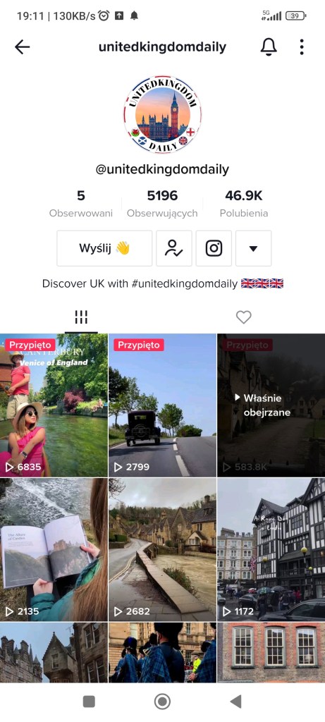 Filmiki, zdjęcia z Wielkiej Brytanii. Podoba mi się ich akcent, lubię Monty Phytona, śledzę losy rodziny królewskiej, chciałabym odwiedzić m.in Londyn i Edynburg, znajdują się tam też urocze wioski i ogólnie uważam, że Wielka Brytania ma swój niepowtarzalny klimat.