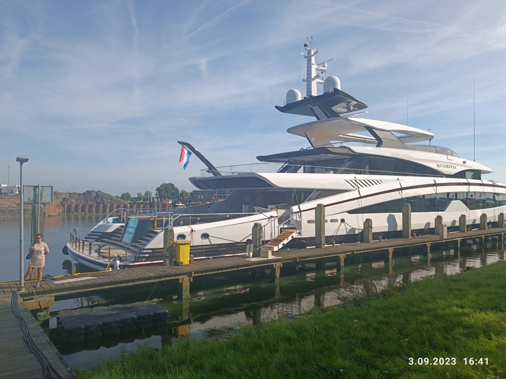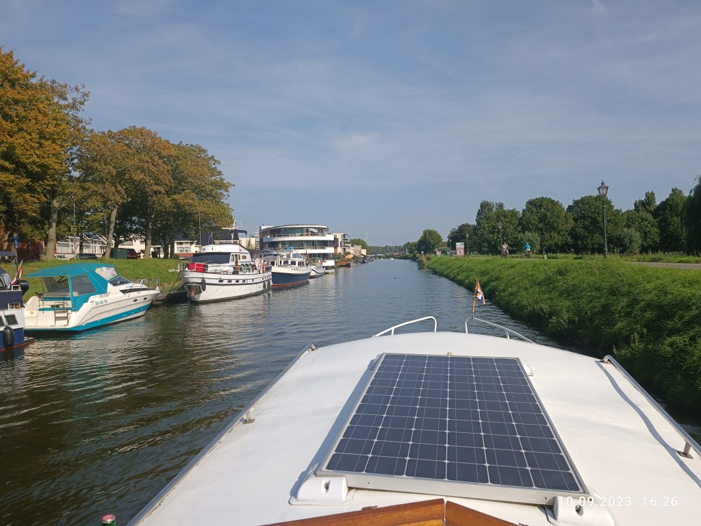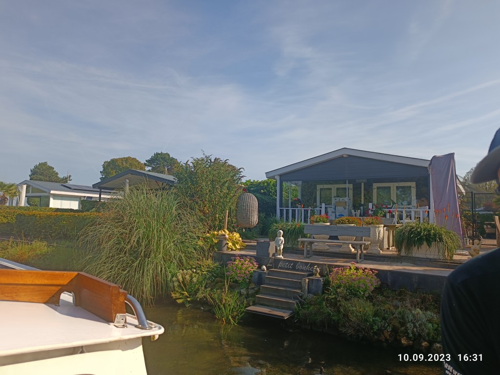 Dzień przed urlopem, znajomy Holender zaprosił nas na swoją łódź. Płynęliśmy kanałami na szersze wody i wtedy pierwszy raz siedziałam za sterem. Fajna sprawa. Prowadzi się łatwo, ale obowiązują jednak na wodzie zasady, z których nie do końca zdawałam sobie sprawę. Trzeba np pilnować prędkości. Są widoczne duże znaki, które informują ile km/h można płynąć. Usłyszeliśmy historyjkę o facecie (płynął akurat swoją łodzią obok nas), który jest bogaty- ma kilka mieszkań a latem w żadnym nie przebywa, bo mieszka na tej swojej łódce.