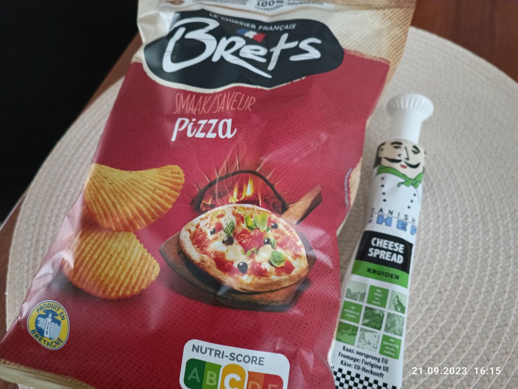Chipsy jem rzadko, ale ostatnio skusiłam się na do tej pory nie znany mi rodzaj o smaku pizzy. Do tego pasta serowo- ziołowa w tubce i niebo w gębie 🙂