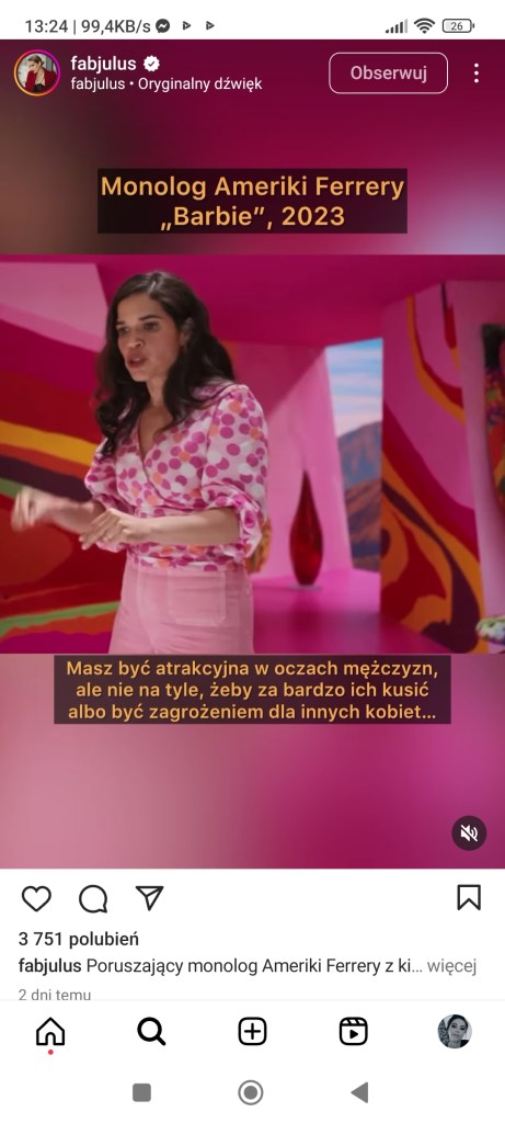 Obejrzałam film „Barbie”. Nie, nie w kinie. I dobrze, że do kina nie poszłam, bo po prostu nie rozumiem fenomenu tej produkcji i szału na kolor różowy. Owszem, grają tam znani aktorzy, których nawet lubię, ale sądzę, że gdyby nie ta gigantyczna promocja, to film szybko przeszedłby bez echa. Jest tam głównie o przesłaniu do kobiet, że nie powinny być pod presją społeczeństwa i zachowywać się i wyglądać tak, jak się tego od nas oczekuje. Od dawna się o tym zresztą mówi, ale nie wszyscy rozumieją. I nie wiem, czy po tym filmie będzie lepiej…