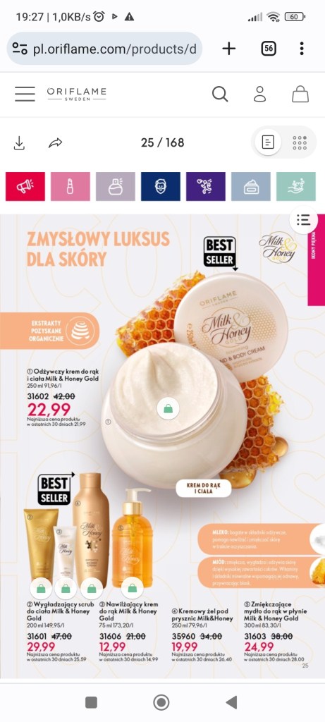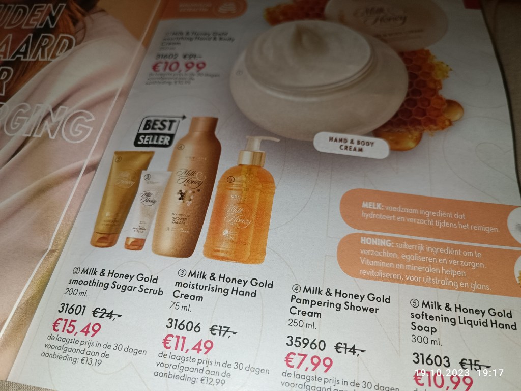 Kolejna seria, to „Milk & Honey Gold”. Mamy 250 ml krem do ciała, scrub, krem do rąk, żel pod prysznic i mydło w płynie. Ceny: po lewej holenderskie, po prawej polskie: