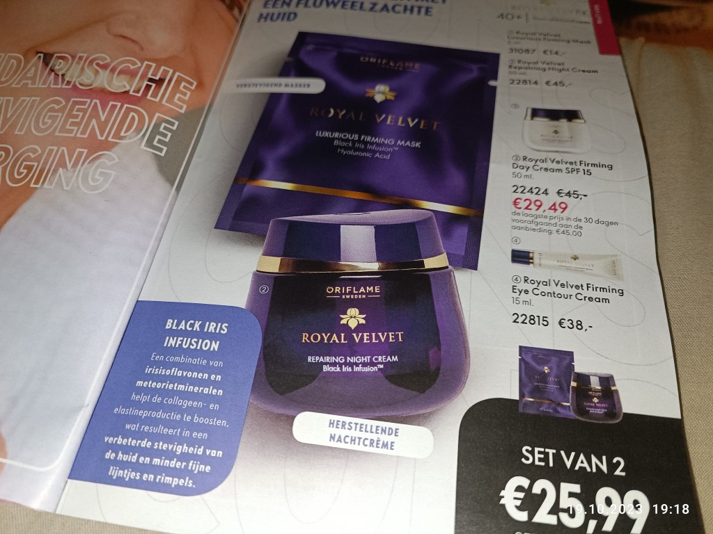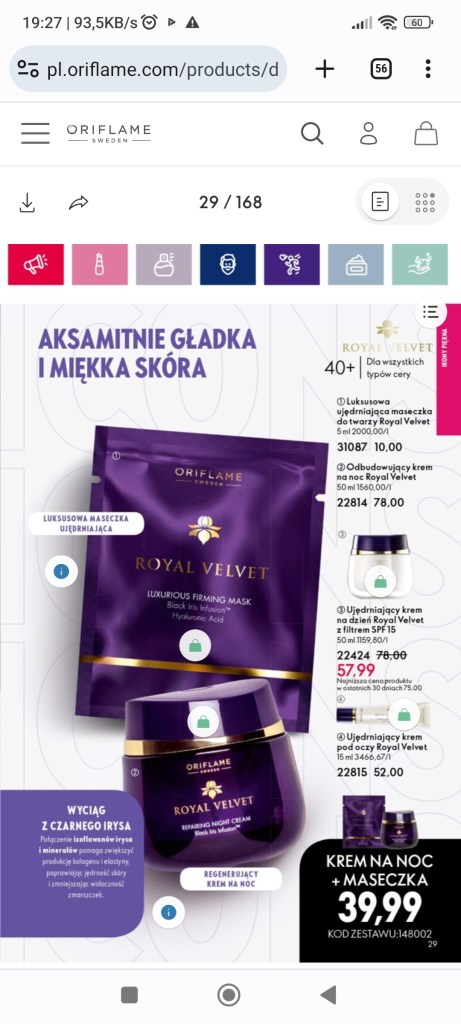 Kolejne porównanie, to seria przeciwzmarszczkowa „Royal Velvet”. Maseczka w płachcie i krem na noc to razem 25,99€ a w Polsce 39,99zl.