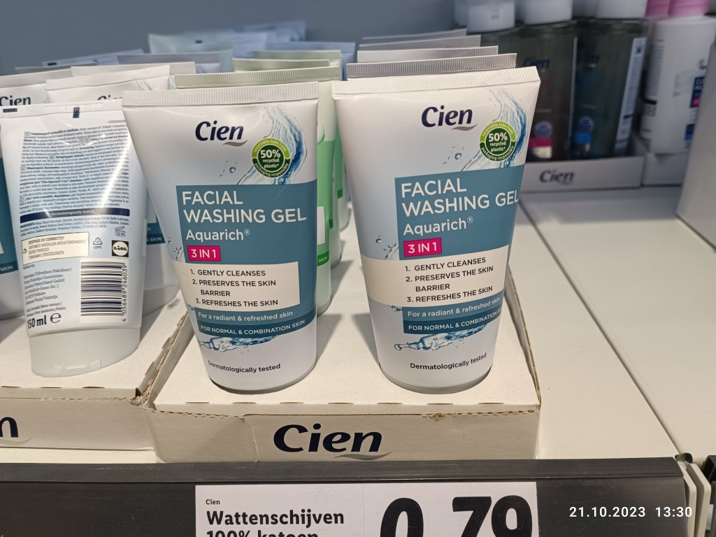 Pierwszym kosmetykiem jest żel do mycia twarzy. Dawno temu upodobałam sobie żel z Nivea (niebieska tubka) z kwiatem lotosu. Ładny zapach, dobrze mył gębę. Jeśli się skończył, to sięgałam po bardzo podobny z Cien. Inny zapach, ale mycie, pielęgnacja jak dla mnie, taka sama. Ostatnio dowiedziałam się przypadkiem, że Nivea testuje kosmetyki na zwierzętach! 21 wiek i takie coś? No słabo… Kończę więc resztkę produktów tej firmy i więcej do niej nie wrócę, a szkoda, bo dobre rzeczy ma. I teraz cały czas używam żelu z Lidla. Ostatnio wyszły nowe rodzaje: do każdego typu cery i z delikatnym peelingiem. Wybrałam ten pierwszy i jestem zadowolona.
