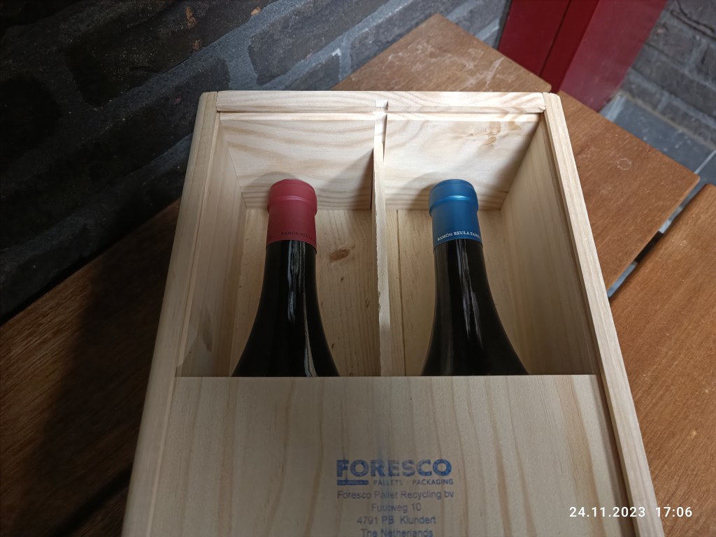 Ostatni w tym sezonie prezent w postaci wina od kierowcy tira, który przyjechał po palety z pomidorami. Dokładniej opisując, to dwie butelki hiszpańskiego wina (białe i czerwone) w drewnianej skrzynce. Koleżanka wzięła czerwone a ja białe. Skrzynka została dla mnie. Przydała się do przechowywania rzeczy do scrapbookingu.