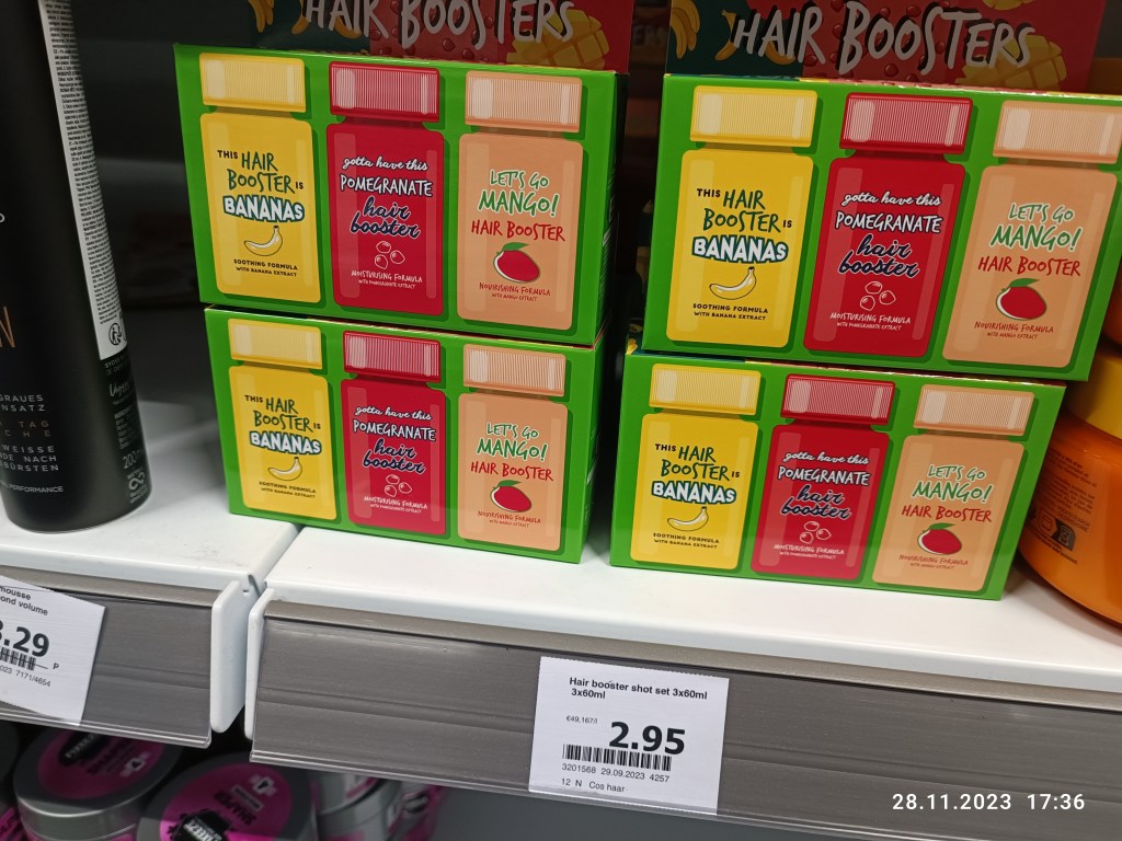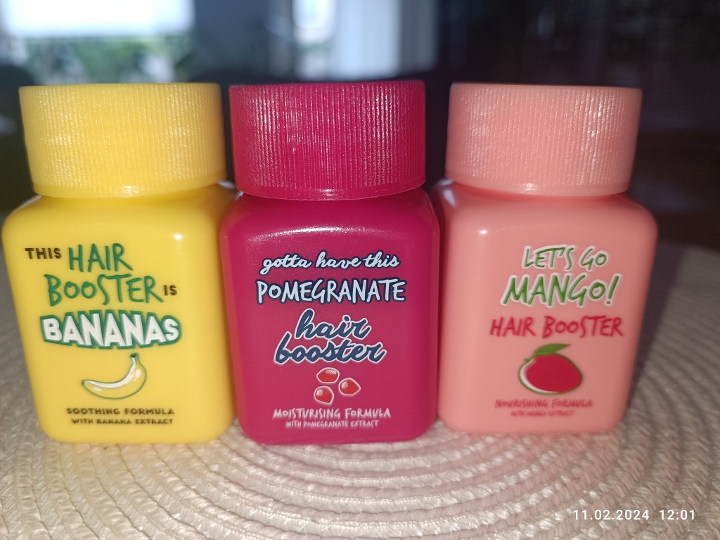 Hair Booster, który kupiłam chyba ze dwa miesiące temu w Actionie. Lubię tamtejsze kosmetyki do włosów- od farb po spraye. To serum skusiło mnie kolorowymi buteleczkami.