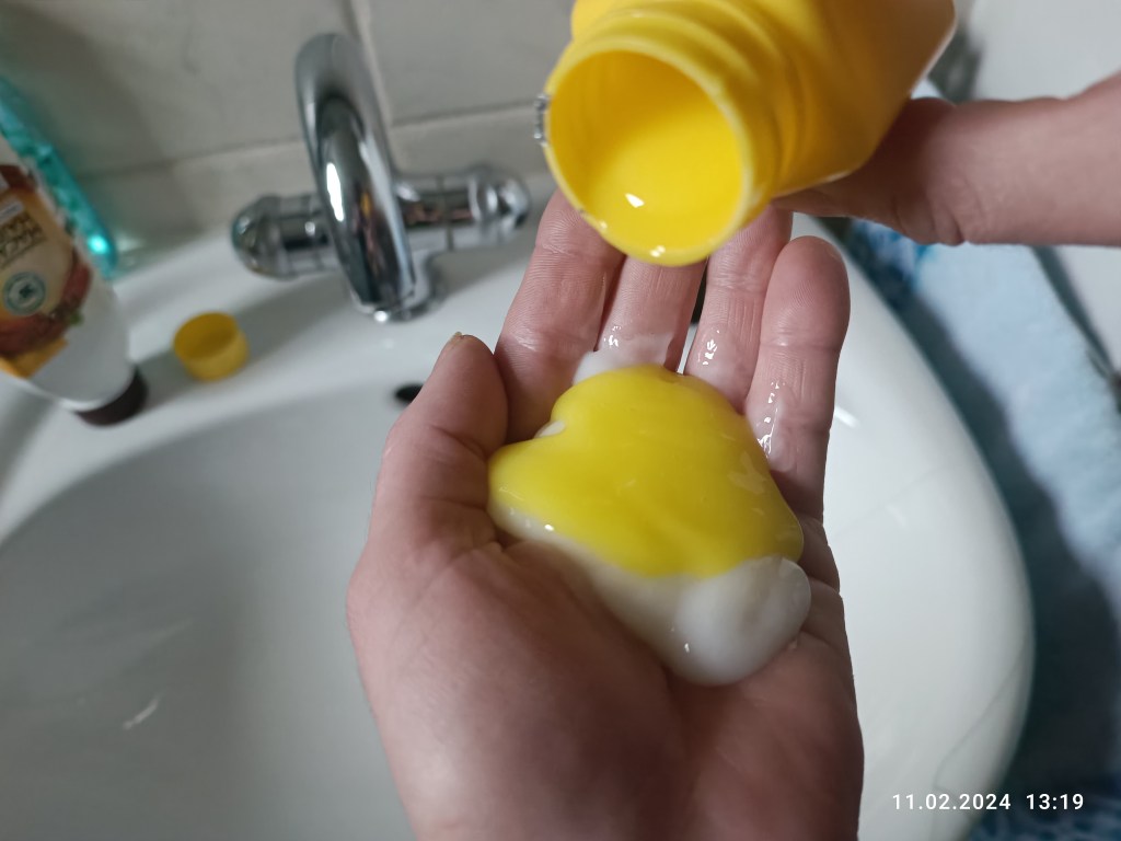 Postanowiłam zacząć od banana. Serum jest gęste, więc stwierdziłam, że warto potrzymać na włosach i spłukać. Zmieszałam je z odżywką „po farbowaniu”. Pachniało na włosach mocno bananem. Trzymałam około pięć minut.