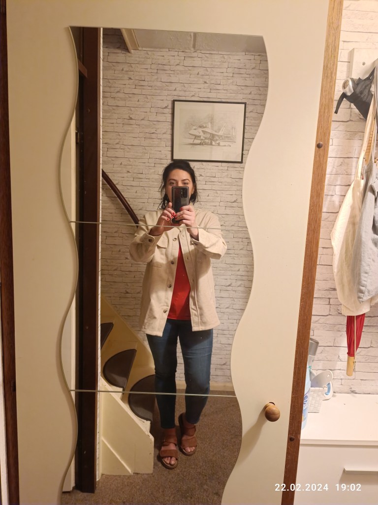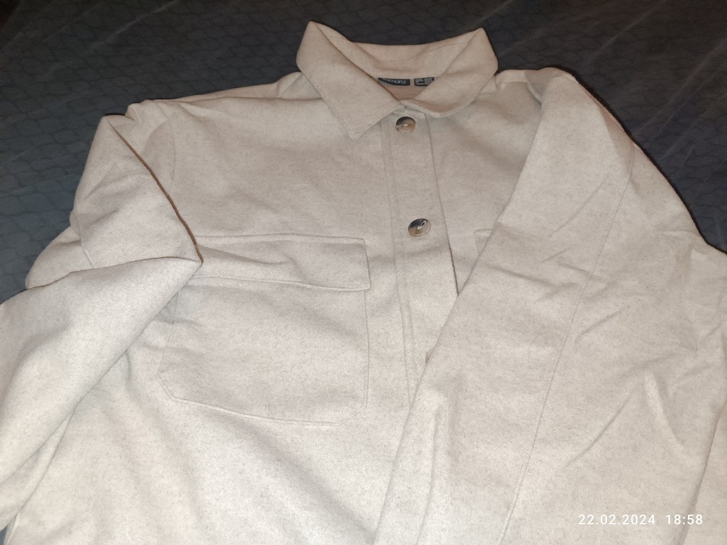 Overshirt – nie wiem, co to za materiał, ale jest przyjemny w dotyku i widać, czuć, że ta koszula świetnie się sprawdzi jako „narzutka” na chłodniejszy dzień. Posiada długi rękaw i dwie kieszenie z przodu. Kolor piaskowy. Uwielbiam takie koszule. Specjalnie wzięłam rozmiar większy, żeby pod spodem upchać na siebie bez problemu inną bluzkę. Najlepiej wygląda rozpięta.