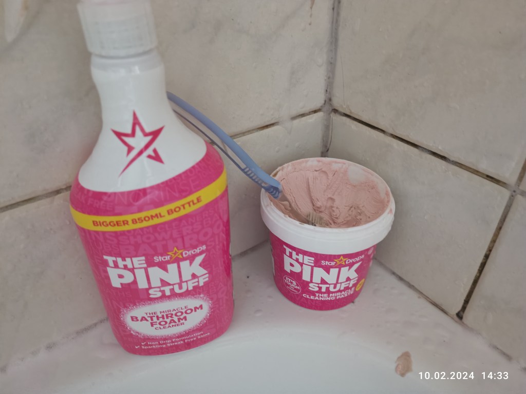 Teraz trochę „polecajek”. Robiłam generalne porządki w domu i postanowiłam jeszcze raz porządnie wyszorować fugi w łazience. Internet zachwala różowe cudo „Pink Stuff” więc i ja postanowiłam to wypróbować. Kupiłam spray i pastę. Jestem pozytywnie zdziwiona, bo nawet nie musiałam się wysilać z szorowaniem i stary brud bez problemu zszedł.