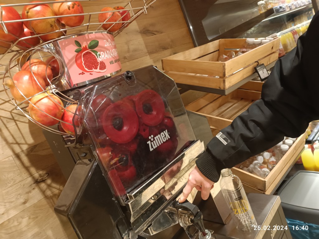 W supermarkecie Jumbo, do którego coraz częściej zaglądam, pojawił się nowy automat do soku. Do tej pory był z pomarańczy a teraz obok stoi jeszcze do granatów. Małą buteleczkę kupiłam. O ile owoce same w sobie nawet lubię, tak wiem, że soku więcej się nie napiję. Za cierpki 😆 Oglądałam też dekoracje wiosenne z żonkili.