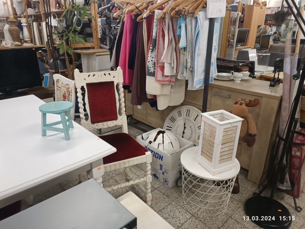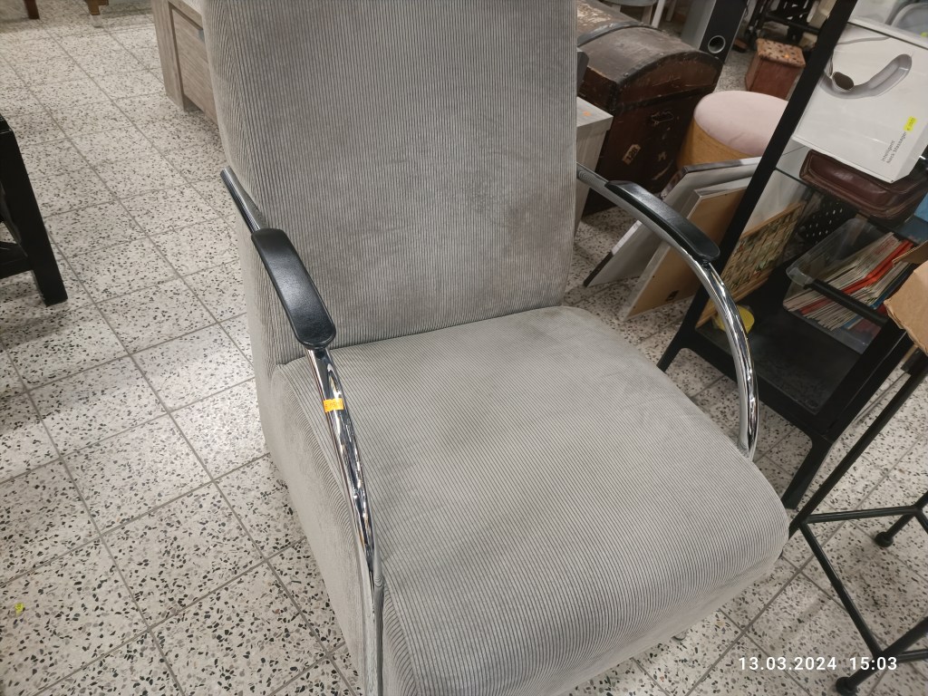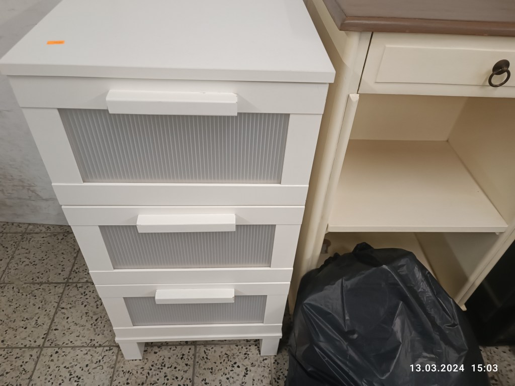 Zwróciłam uwagę na białą szafkę z trzema głębokimi szufladami. Kosztowała 15€ . W ogóle niezniszczona. Jedyne, co bym zmieniła, to kolor: na brąz 🙂 Zaraz obok stał bardzo wygodny szary fotel z metalowymi podłokietnikami.