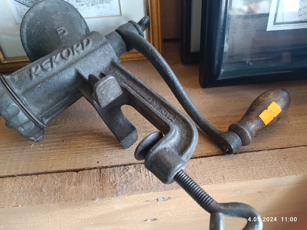 Na koniec coś, co mnie zaskoczyło. Chyba każdy dorosły zna kultową maszynkę do mięsa. Taką przykręcaną do stołu. Ręczną. Używała jej np moja babcia i ma do tej pory. My też taką posiadamy. Dostaliśmy od Pana Męża ojca i służy do dziś. Dobry sprzęt. Mały a mieli wszystko. W kringloopie też się znalazł. Wyglądał na mocno zużyty i wydawał się już raczej nie do użycia. Tylko ta cena… Nie przypuszczałam, że ta stara maszynka może kosztować aż 25€!