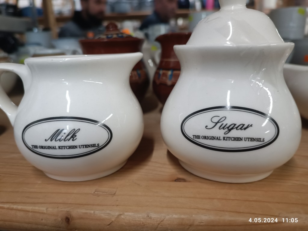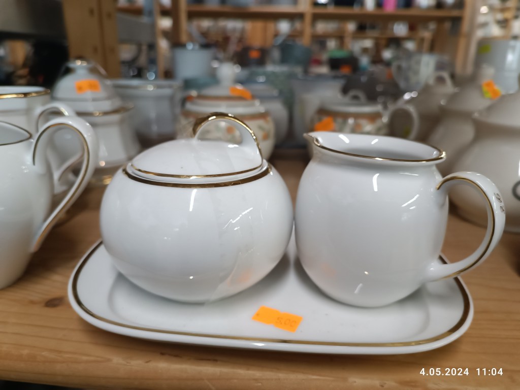Miałam też komplet z kringloopa: cukiernicę i naczynie na mleczko do kawy. Wieczko cukiernicy niestety stłukłam ja i nie wyglądało to dobrze. Tym razem wyłożyli sporo nowego towaru i znalazłam nowy komplet.