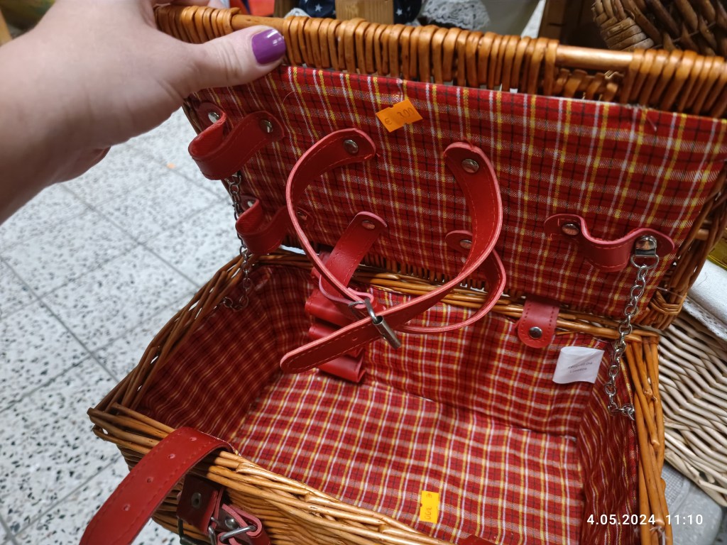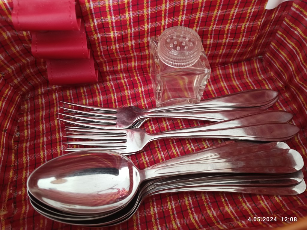 Pan Mąż wypatrzył komplet łyżek: sporych, głębokich, takich żeby się wygodnie zupę jadło. Ja dołożyłam komplet widelców, bo zawsze jakiegoś brakuje. To chyba kolejna rzecz po skarpetkach, która ginie. Wypatrzyłam też mały kosz piknikowy, ale bez zawartości. To nie jest problem, bo mamy już jeden duży z naczyniami. A ten jest fajny, poręczny. I znalazła się też mini solniczka szklana (przyda się) a ja zdecydowałam się na drewniany komplet na sól i pieprz. Stoi sobie teraz na chlebaku obok młynka z korbką do mielenia.