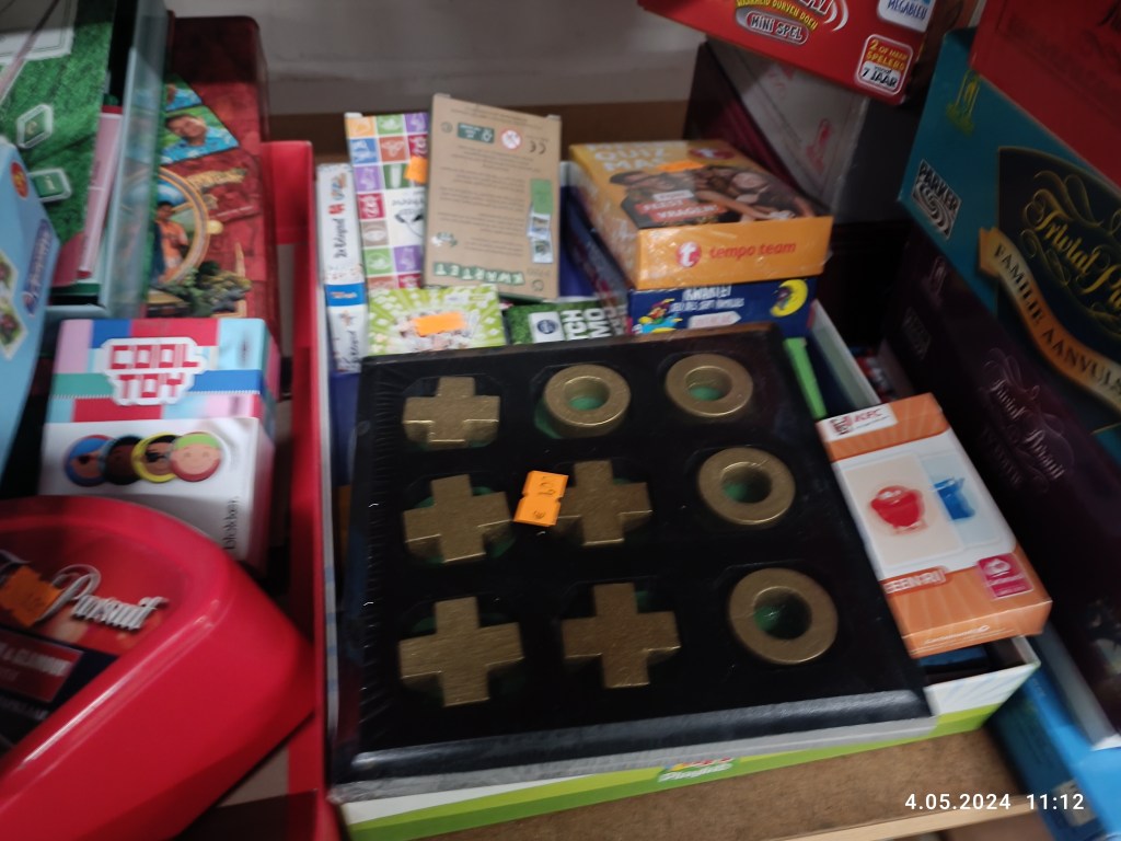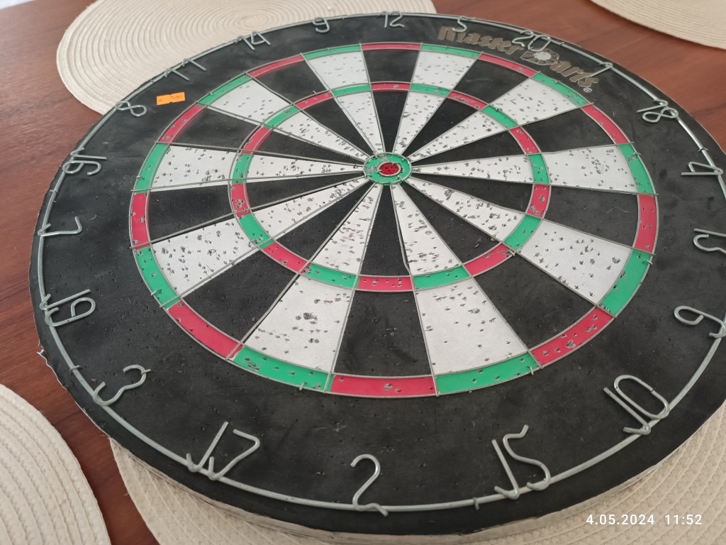 Pan Mąż zainteresował się grami. Znalazł tarczę do rzucania lotkami. Kupił, bo chce grać. Jest używana, ale porządna bo metalowa. Brakuje lotek, ale można je kupić oddzielnie w internecie. Do tego dołożył grę w kółko i krzyżyk. Co ciekawe, dowiedziałam się, że w Holandii nazywa się to podobno: botter, kaas, eieren – czyli masło, ser, jajka. Oni to tu mają nazwy 🙂