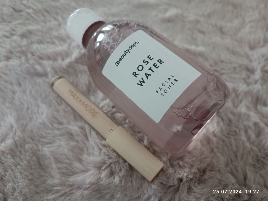 Zapas mojej ulubionej wody różanej w nowym opakowaniu. Nie rozstaję się z nią. Pachnie delikatnie różami i genialnie nawilża moją twarz. Idealna po kąpieli i w podróży, gdy trzeba się odświeżyć. Obok korektor pod oczy. Używam, mieszając trochę ciemnego odcienia z tym jasnym. U mnie sprawdza się bardzo dobrze.