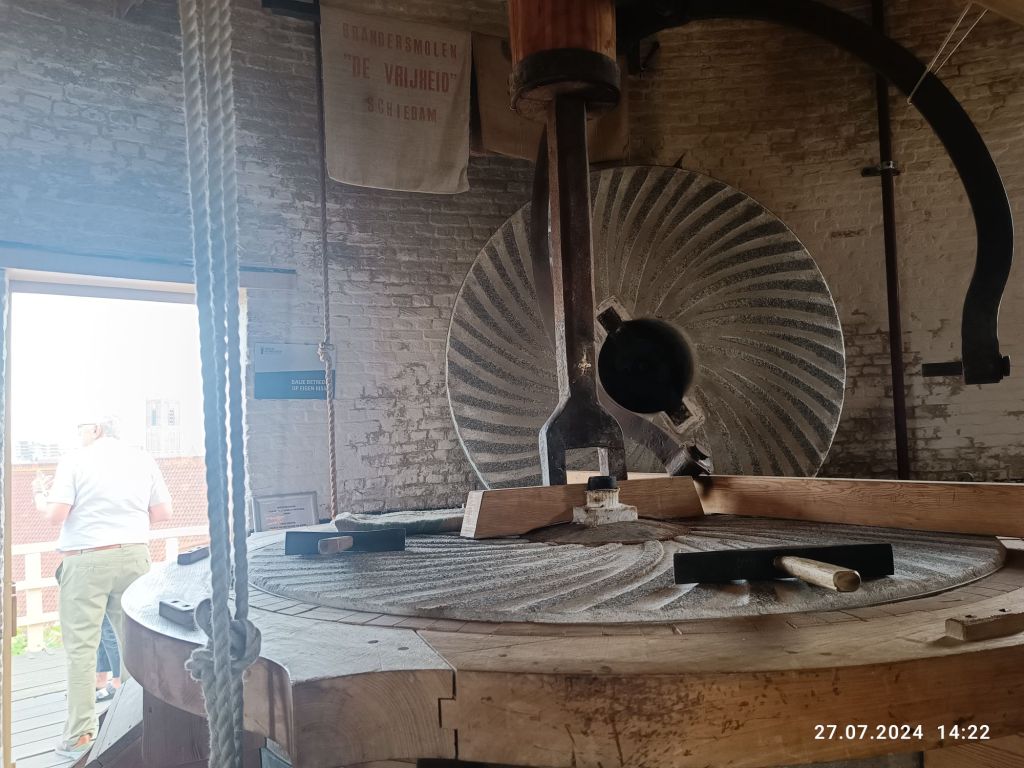 Udaliśmy się zwiedzić wielorybka. Bilet kosztował 8€. Młyn ten powstał w 1794roku a swoją nazwę zawdzięcza ulicy Walvischstraat, gdzie działał przemysł wielorybniczy, którym zajmowali się rybacy z Schiedam. Zbudowano go głównie na potrzebę produkcji słodu. Ale mielił nie tylko dla palarni. Na początku lat 30tych, wytwarzano w nim nawet magnez. W 1954 roku zamieszkiwała w nim rodzina Kluitów. Niestety nie znalazłam nic na ich temat. Wiatrak był często gruntownie odnawiany.