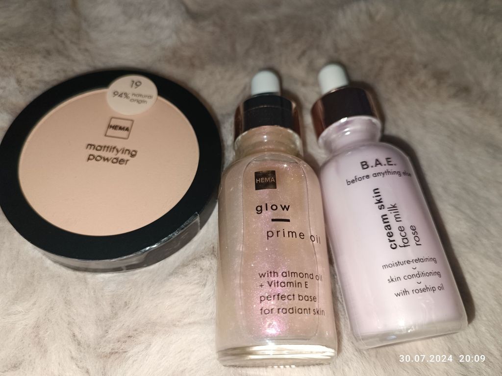 Mam mieszaną skórę, więc testuję różne pudry matujące. Tego jeszcze nie używałam. Czeka na swoją kolej. W środku olejek- primer rozświetlający z witaminą E. Będę go używać jedynie na policzki. Obok kremowe mleczko o zapachu różanym. Nie przepadam za tym zapachem, ale ten jest naprawdę delikatny a sam kosmetyk świetnie nawilża.
