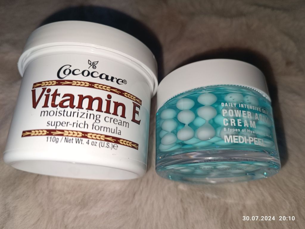 Po prawej stronie jest „Power cream”, czyli to, co ma tak świetnie działać na skórę. Przykryty jest plastikowym wieczkiem, posiada szpatułkę a w środku znajdziemy turkusowy żel a w nim zatopione białe „kulki” kremu. Wygląda to ciekawie i całkiem przyjemnie pachnie. Po lewej nawilżający krem z witaminą E kupiony z myślą o Panu Mężu, bo ma przesuszoną skórę twarzy. Jest niemal bezzapachowy i dobrze się wchłania.