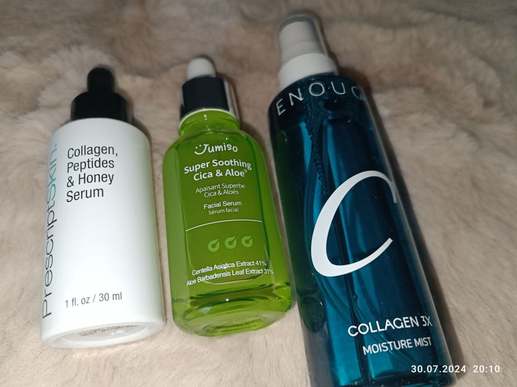 Uwielbiam mgiełki do twarzy. Ta po prawej ma piękny, kremowy zapach i zawiera collagen. Co jeszcze lubię? Aloes i miód. Zwykły miód często nakładam na twarz i jest to zbawienne dla skóry. Po lewej znajduje się serum z peptydami, miodem i kolagenem. W środku zaś, uspokajające i nawilżające serum z aloesem.