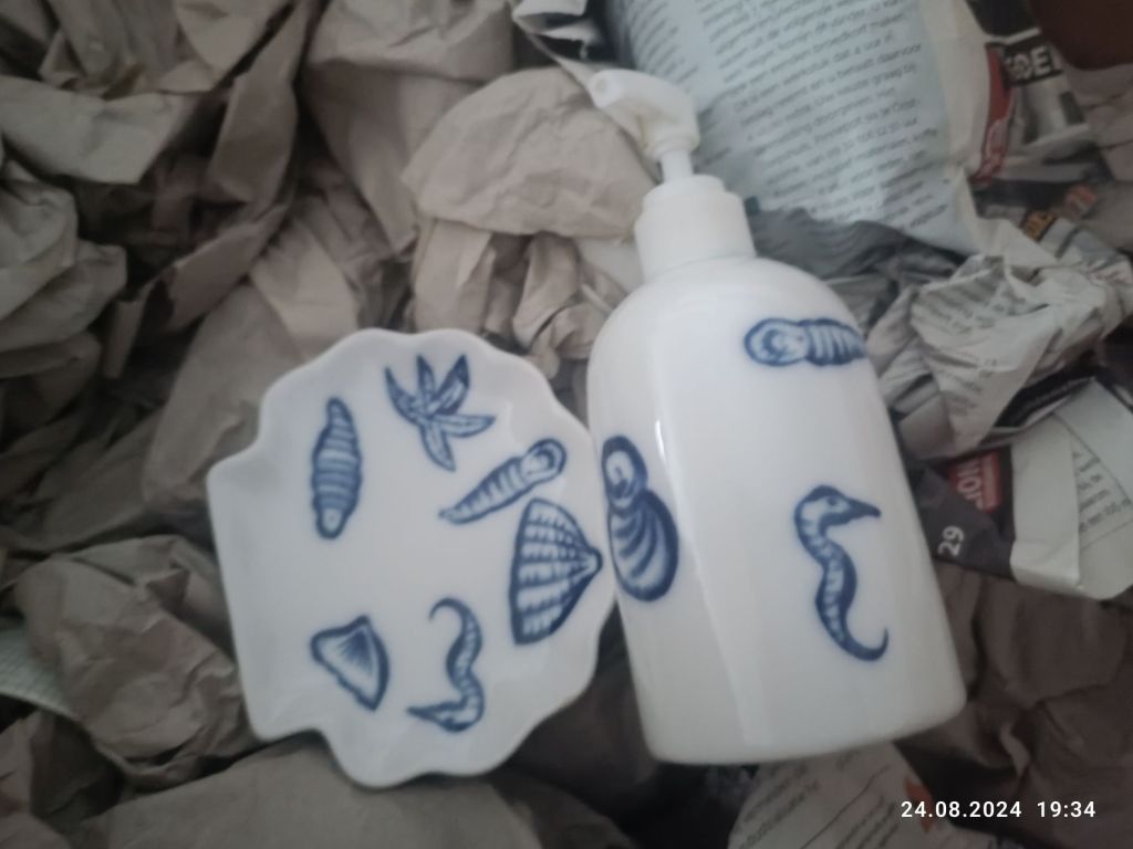 Przy okazji, w pudle znalazłam komplet do łazienki z motywem morskim: mydelniczka w kształcie muszli i pojemnik na mydło w płynie. Zupełnie zapomniałam, że takie coś mam.