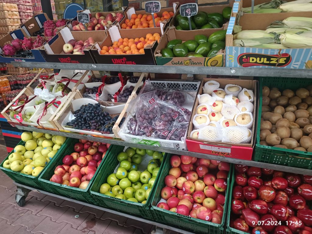 Gdy się tu wejdzie, oczy cieszą się ogromną ilością kolorów i rodzajów chociażby papryk. Ceny są niższe, niż w marketach holenderskich, no i świeżość tutaj ma ogromne znaczenie, bo na przykład zioła w doniczkach, czy pęczki koperku albo natki pietruszki, są regularnie pryskane wodą, żeby nie zeschły się. Na przeciwko warzyw, są kosze z owocami. Wiadomo: kilka rodzajów jabłek, gruszki, truskawki, ogromne kulki winogron, ale też melony, arbuzy czy kokosy.
