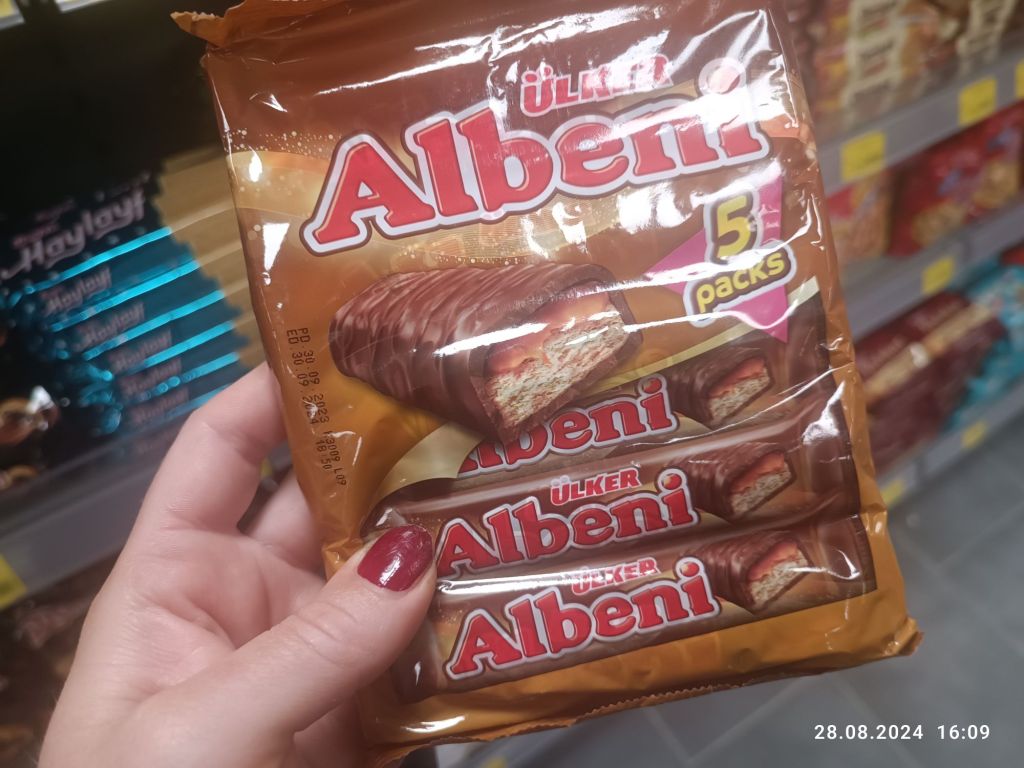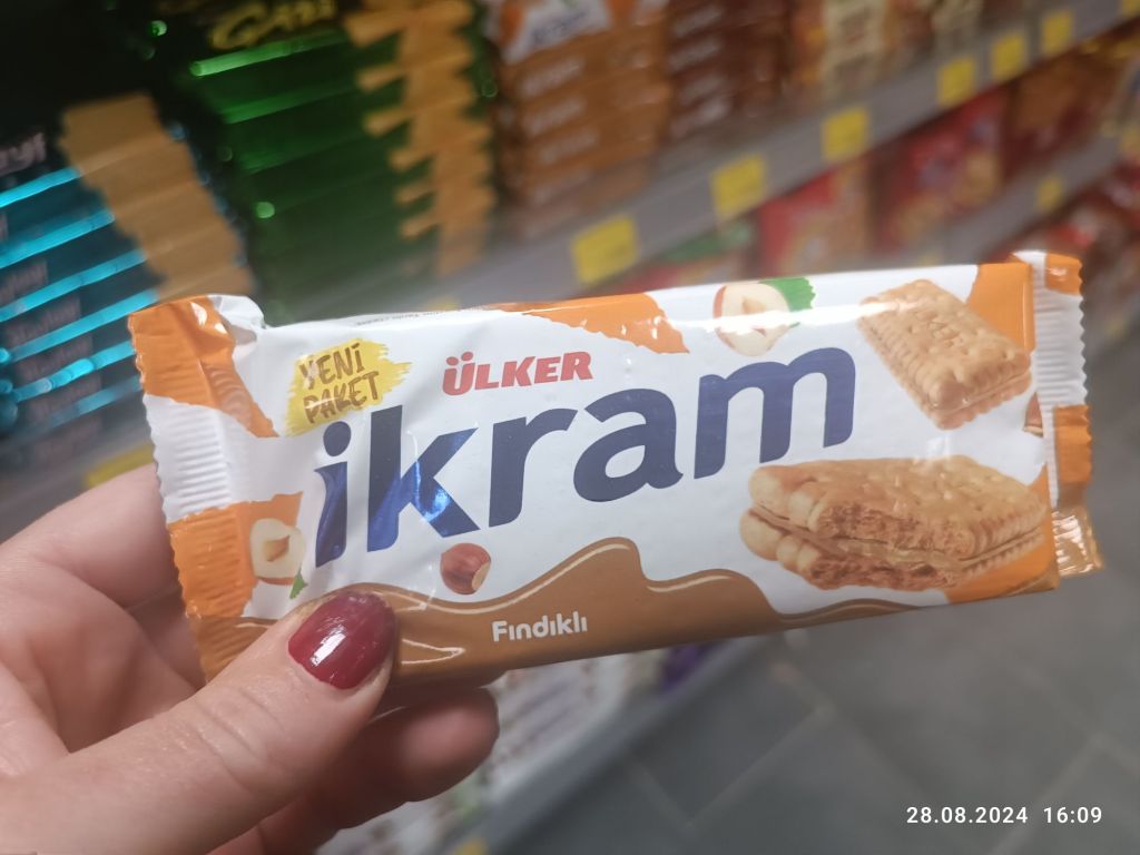 Jeszcze powinnam napisać o słodyczach. Przede wszystkim nie lubię baklavy. Za słodka. Ale np batony, czy ciastka mają jakiś limit cukru. Słodyczy jest tu cała alejka. Ja zawsze wybieram wafelki w czekoladzie, czasem batony a dzisiaj paczkę malutkich, kruchych herbatników przełożonych kremem orzechowym. Niebo w gębie.