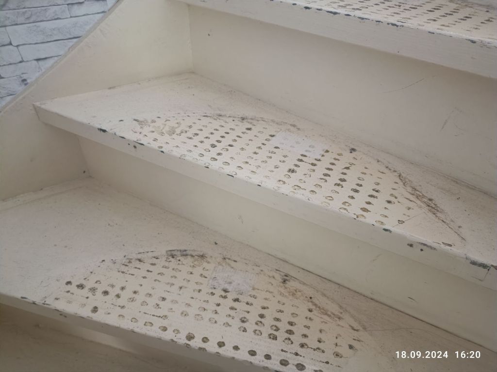 A tu schody, które mnie doprowadziły do szału. Dywaniki przyklejone na amen w pacierzu a do tego każdy przytwierdzony czterema śrubkami. Było roboty z usuwaniem kleju, ale malować trzeba dwa razy.