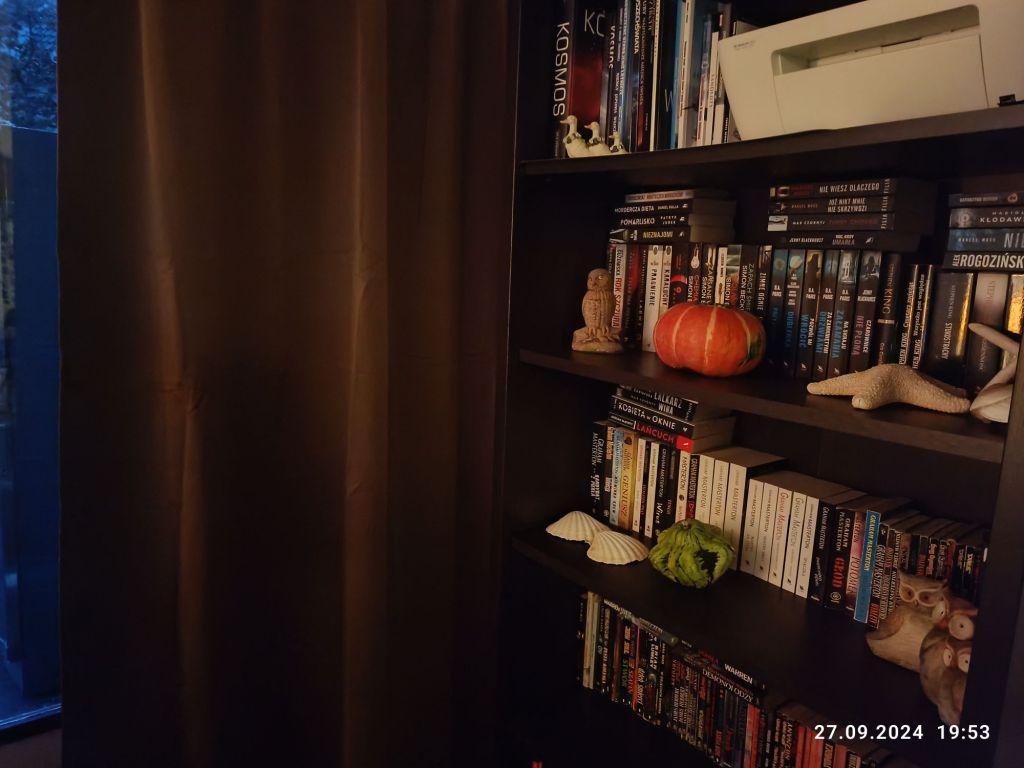 Regał z książkami w salonie też uporządkowany. Nie ma kurzu a książki są znowu elegancko poukładane. Zniknęły zbędne szpargały a pojawiły się kupione wcześniej dynie.