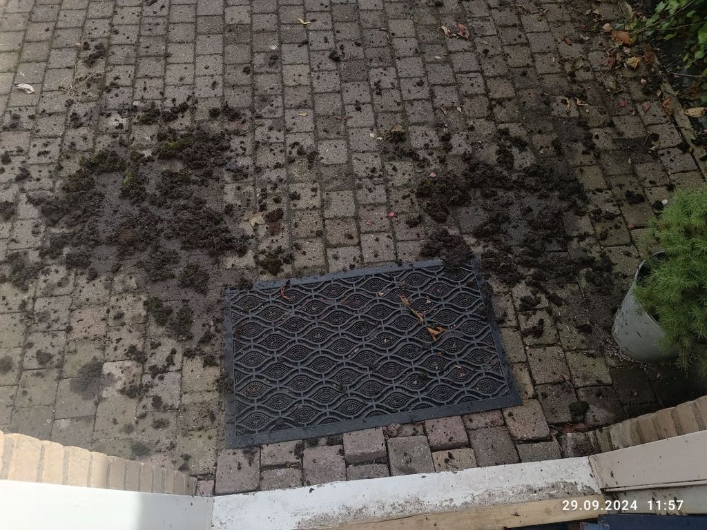 Pan Mąż pożyczył od sąsiada wysoką drabinę, bo chciał naprawić rynnę. Była dziura, bo woda z niej kapała na parapet okna łazienki. Najpierw wziął się za jej czyszczenie i taki był efekt, że najpierw muszę porządnie kostkę wyczyścić, żeby ułożyć kompozycję z wrzosów: