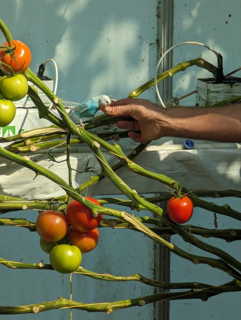 W czasie, gdy ja siedziałam w domu, na szklarni pojawiła się papużka falista! Szef dał jej wody, ale to za mało dla tego ptaszka, bo padł by prędzej z głodu, niż z pragnienia. Nie była bardzo płochliwa, ale niestety złapać się nie dała. Próbowali, ale uciekała. Szkoda, bo bym miała czwartą za free. Musiała wlecieć przez otwarte w dachu okno i nie wiadomo, co z nią się stało 😦