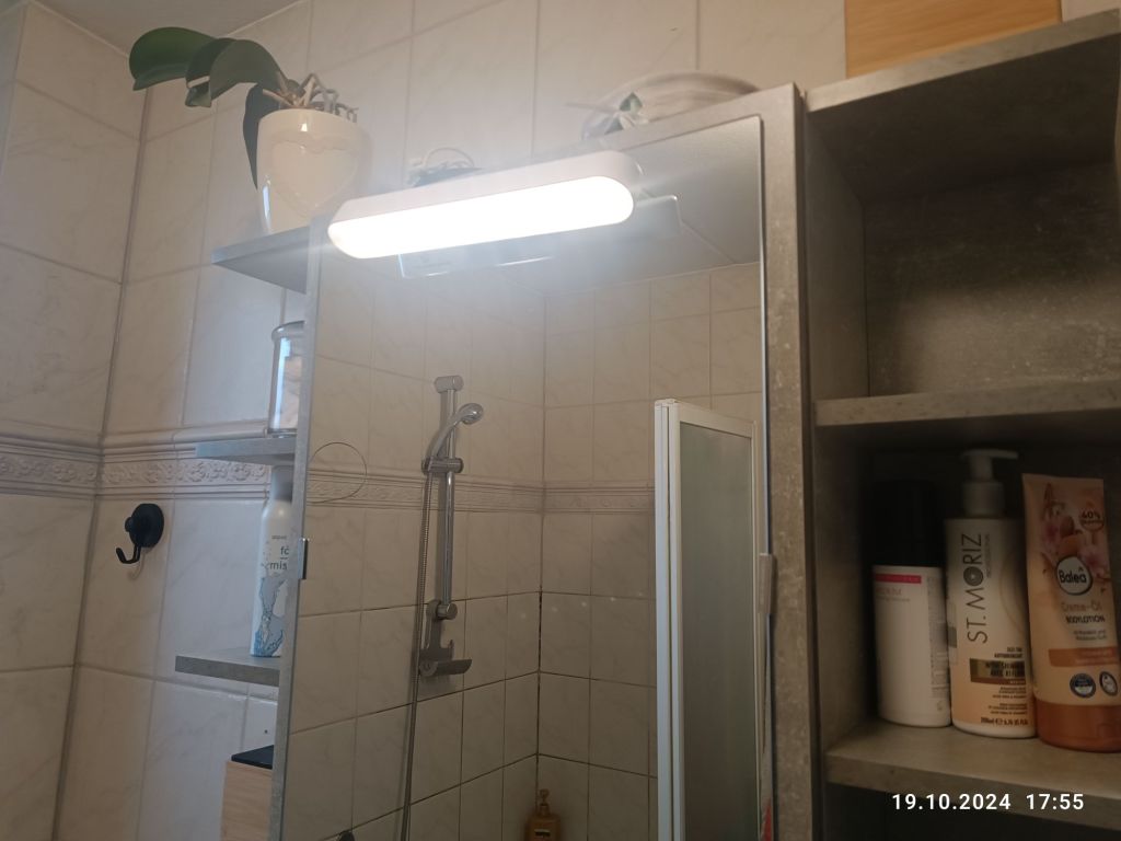Pan Mąż wreszcie znalazł chwilę i zamontował nową szafkę w łazience. Poprzednia była metalowa i od wilgoci rdzewiała. Poza tym ciężko się ją myło. Miała zamontowane kable ze światłem, które wkładało się w pokoju obok do kontaktu. Wszystko zostało rozmontowane, przewody odcięte i zabezpieczone. Za szafką syf okropny. Żałuję, że wcześniej jej nie zmieniłam. Nowa kolorystycznie pasuje do płytek, ma półki za lustrem i kilka po bokach, ale nie posiada żadnej lampki. Kupiłam ledy na ładowanie ( trzy rodzaje oświetlenia) na Temu i Pan Mąż przyczepił je do lustra. Włącza się je na dotyk. Do tej pory sprawdzają się idealnie.