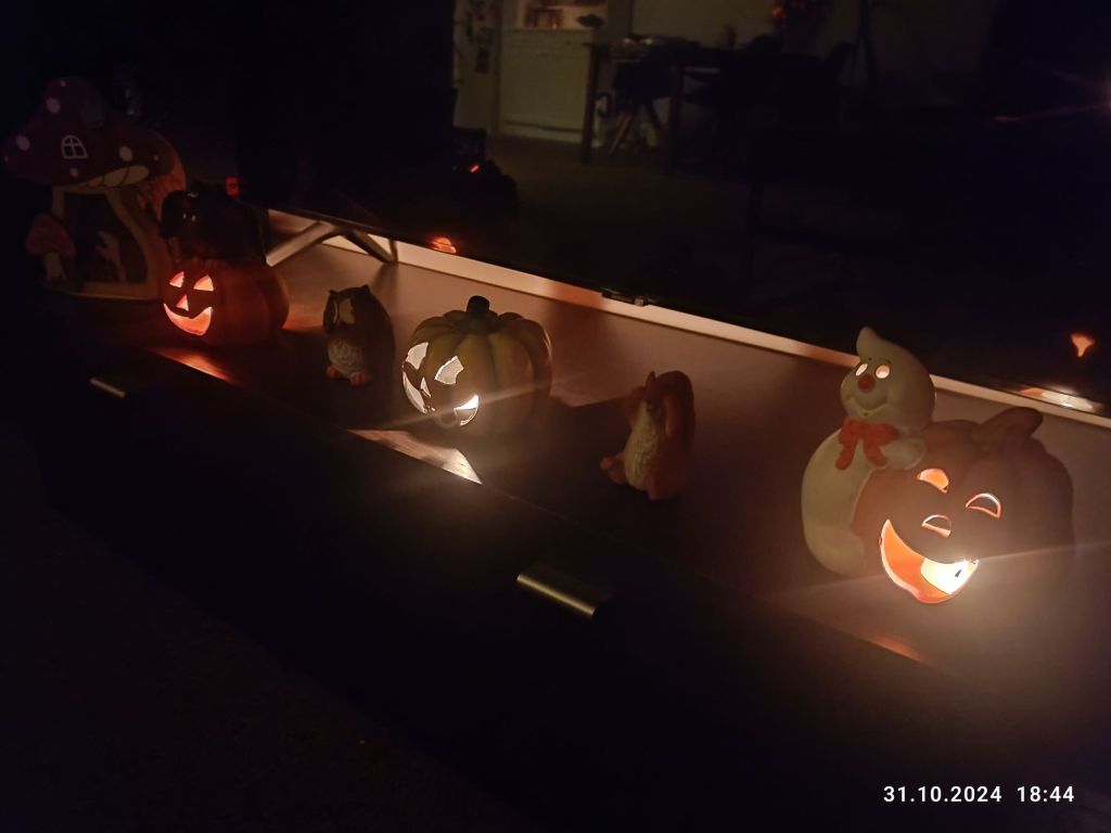W tym roku Halloween wypadło we czwartek. Nie organizowałam żadnej imprezy. Stwierdziłam, że nie ma to sensu, bo i nie ma z kim się bawić a poza tym w sobotę pracowaliśmy. W samochodzie jednak akcent tego święta się znalazł. Podobnie w domu. Sąsiedzi na przeciwko zorganizowali małe party na zewnątrz i muzyka w sobotę grała niemal do 22:00. Ozdobili też dyniami i szkieletami przed domem. Dzieciaki w tym roku za to w ogóle nie chodziły za cukierkami. Trochę smutno, ale chyba nikomu się nie chciało specjalnie świętować i się bawić.