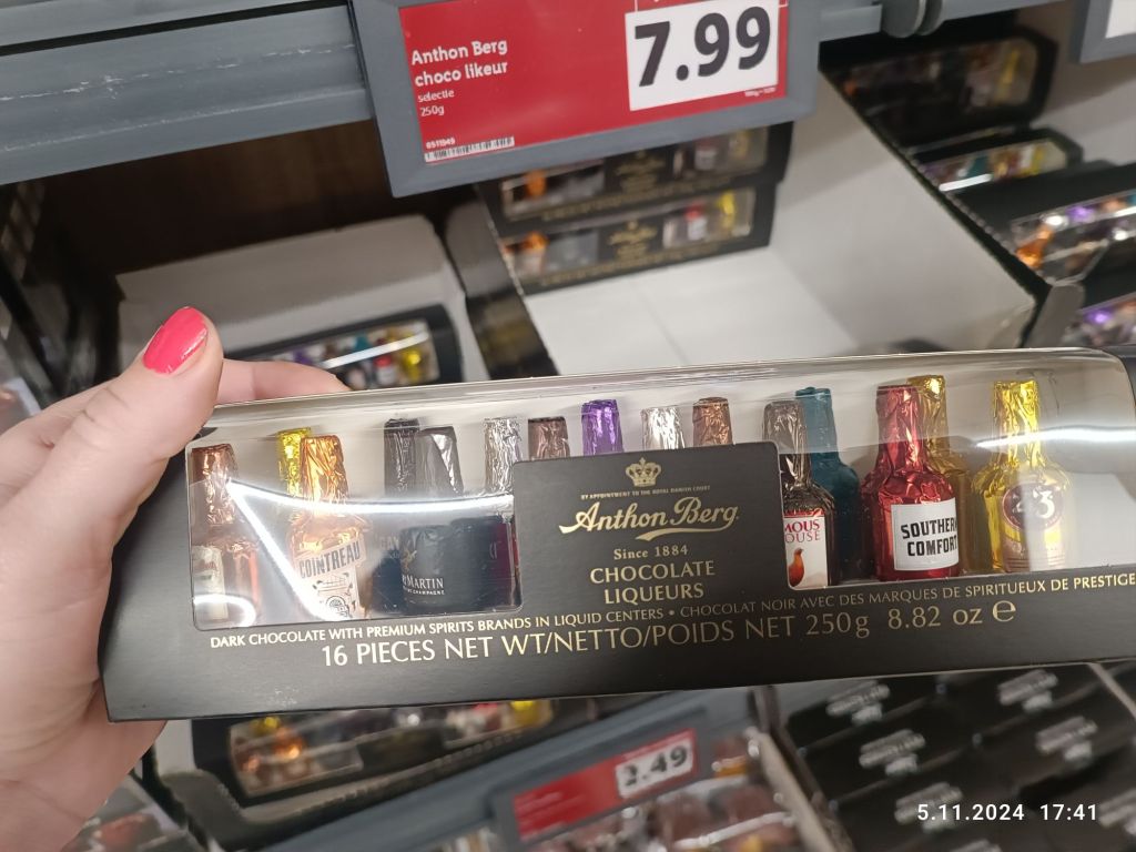 Teraz będzie trochę o zakupach i o tym, co pojawiło się w holenderskich sklepach. Zacznę od Lidla. Dorwałam „bombonierkę”, czyli 16 czekoladek z alkoholem w kształcie butelek. Pamiętam za dzieciaka, jak się takie jadło. Jestem ciekawa, jak to smakuje. Na razie stoi i czeka.