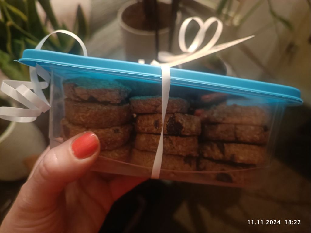 Rozdałam sąsiadom skrzynki z ostatnimi w tym roku pomidorami. Dostałam od jednych za to, pojemnik z domowymi ciastkami. Na bileciku było podziękowanie i opis, że ciastka są owsiane, z rodzynkami i orzechami włoskimi. Były bardzo dobre.