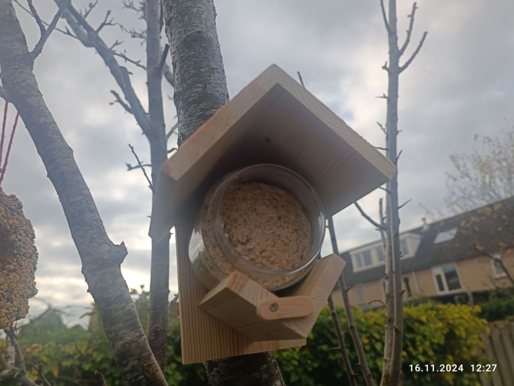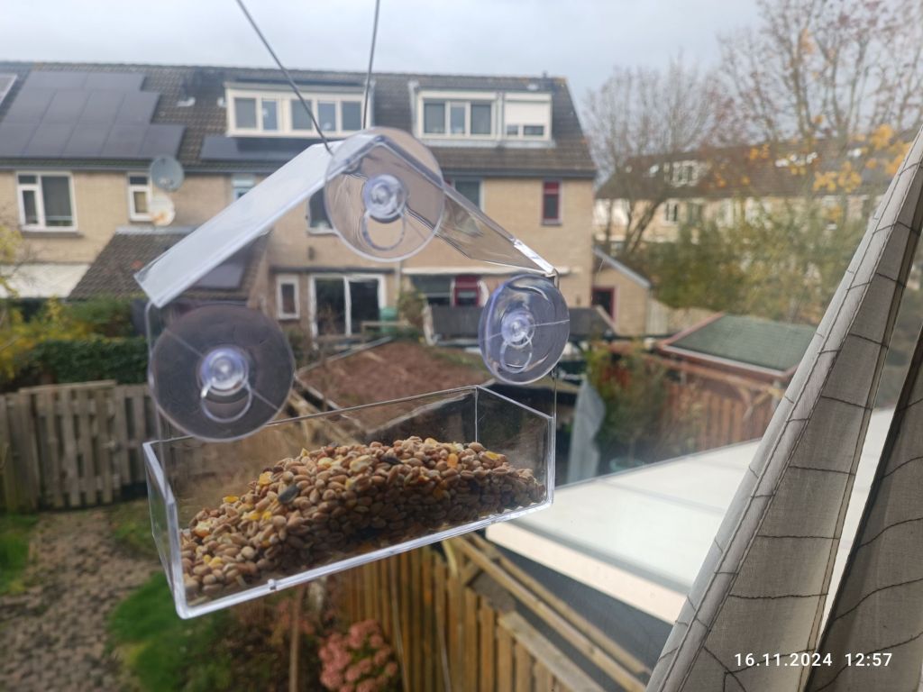 Ptaszki w ogrodzie też mają święta. Pewnej niedzieli obudziło mnie stukanie w szybę. Zobaczyłam sikorki. Nie było innego wyjścia, jak powiesić im pojemniki z ziarnem. Dwa zawisły na drzewie a trzeci został przyklejony na szybę. Znalazłam takie coś w Actionie.
