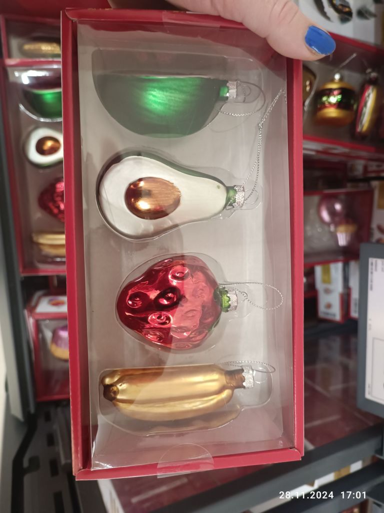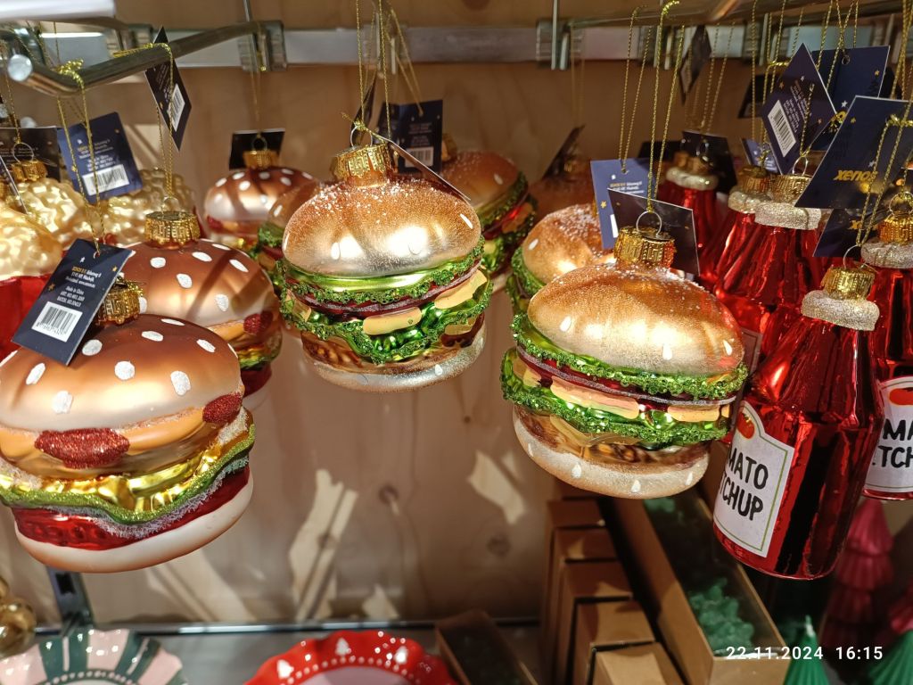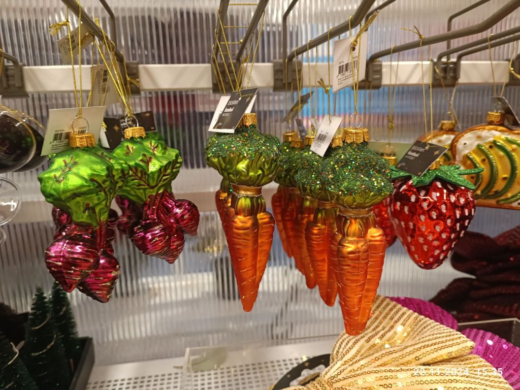 Ozdoby świąteczne też przejrzałam. Na topie są bombki w kształcie jedzenia: owoce, warzywa, hamburgery, przez ketchup po piwo.