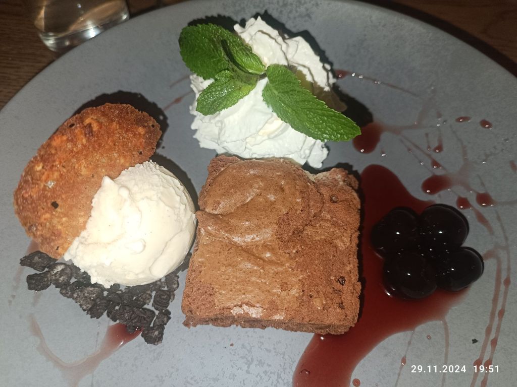 W restauracji było już mnóstwo ludzi. Gdyby nie zarezerwowany stolik, to nie byłoby miejsca. Muzyka fajna, bo lata 90. Jedzenie dobre. Mogliśmy zamówić co chcemy. Podobno jest niepisana zasada, że jeśli ktoś zaprasza do restauracji, to nie wypada zamawiać najdroższych dań z karty. Zresztą, nie chciałam się też objadać na noc. Zamówiłam zupę cebulową, na deser brownie z lodami a do picia dużo wody mineralnej. Ciasto pyszne, a obok dodatkowo znajdowały się mega słodkie winogrona w likierze amaretto.