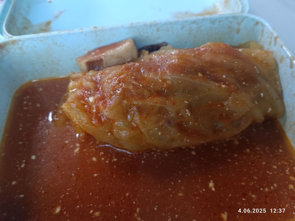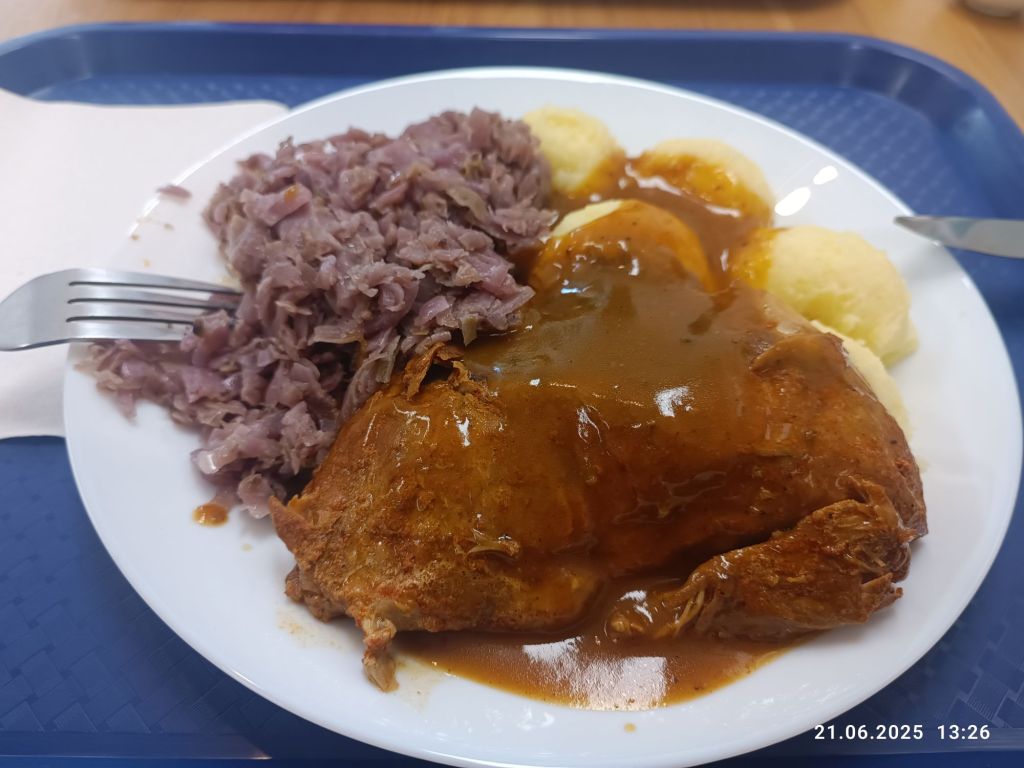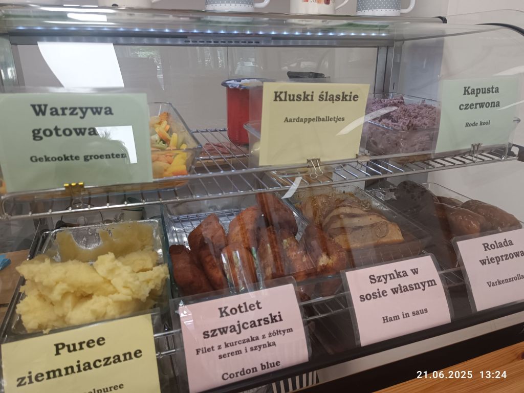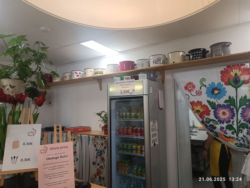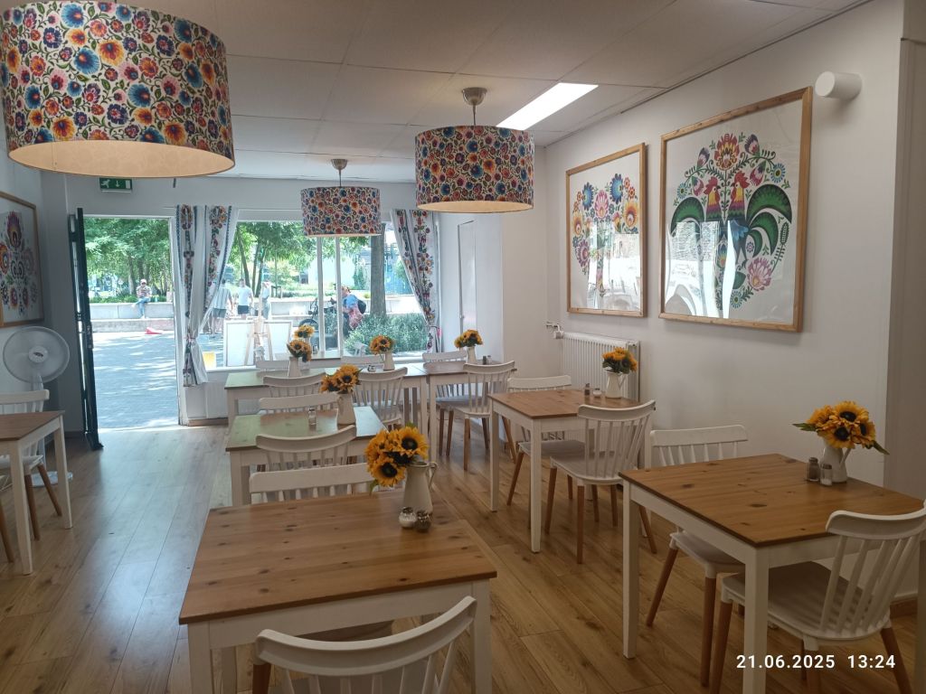 Pan Mąż miał problem z aplikacją bankową i musieliśmy jechać do najbliższego punktu serwisowego (u nas na stałe zamknęli). Po drodze znaleźliśmy przypadkiem polską restaurację „Polka” a że był czas obiadu, to Pan Mąż chciał wejść. Zamówił rosół, który mu smakował, jak domowy, roladę w sosie a ja kawałek szynki w sosie z surówką. Było całkiem dobre. Brakowało mi tylko kompotu. Wystrój bardzo ładny, bo w łowicki wzór. Sporo emaliowanych garnków, jako ozdoba i słoneczniki na stołach. W sumie, to bardziej bar, ale przyjemny i czysty.