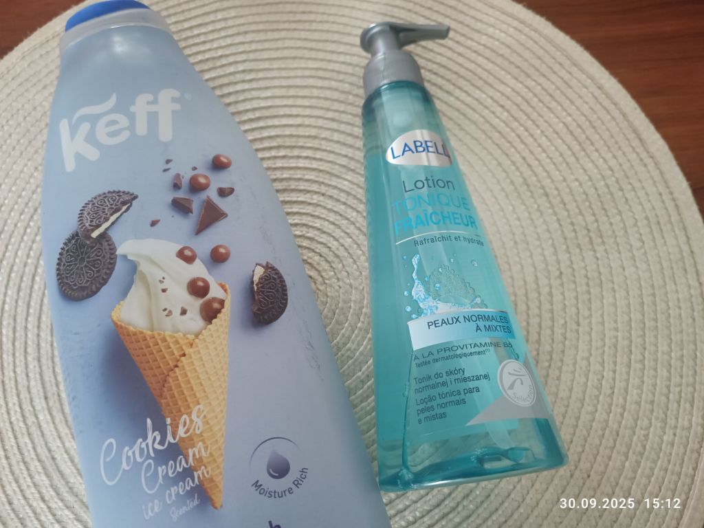 Te dwa produkty nie są z Rossmanna. Tu już kłania się supermarket. Pierwszy produkt kupiłam w Netto. Jest to żel pod prysznic. Były dwa rodzaje: lody o smaku truskawkowym i Oreo. Wybrałam ten drugi, bo ładniej pachnie. Zobaczymy, jak z użyciem. Chodzi mi o pianę i efekt na skórze. Drugi kosmetyk, to tonik firmy  Labell. Produkcja francuska. Producent obiecuje nawilżenie skóry. Także czeka na test. Kupiony w Inter Marche.