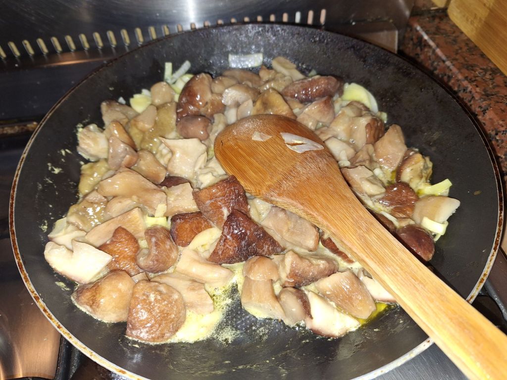 Ja wyjęłam z zamrażalnika grzyby, które zbierałam w zeszłym roku i zrobiłam wreszcie z nich grzybową. Najpierw podsmażyłam na maśle- w całym domu unosił się zapach. Potem wleciał placek z jabłkami i wanilią. Też pachniało.