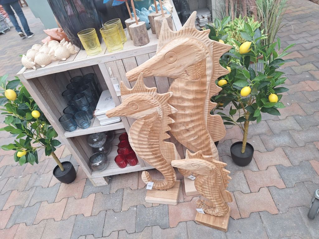 Do Aralii pojechałam sama, bo chciałam w spokoju oglądać rośliny i zrobić zdjęcia. To był dobry pomysł, ale już targanie samej ciężkich worków z ziemią, już nie bardzo, ale jakoś dałam radę. W centrum głównym motywem przewodnim było już lato i wakacje. Na początku zajrzałam na stoisko z morskimi dekoracjami. Piękne są, jak np te drewniane koniki morskie: